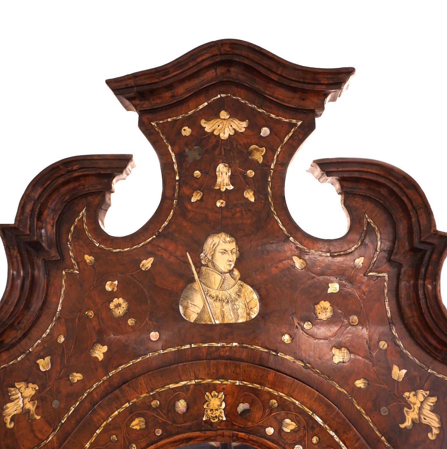 Venetianischer Sekretär aus Nussbaum mit zahlreichen Intarsien. Altes Spiegelglas mit Facetschliff. Italien um 1740-50, Barock. H: 235cm. B: 88cm. T: 78cm