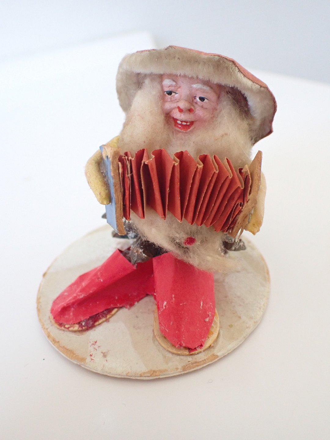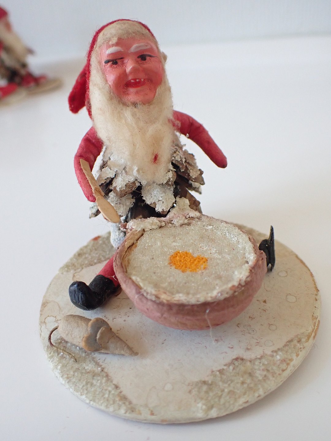 5 koglenisser med henholdsvis grangren, risengrød, piberensernisse, gavesæk, banjo og harmonika. Håndmalede, danske ca. 1930. Højde: 6,5 - 7,5 cm. I pæn tidstypisk stand.