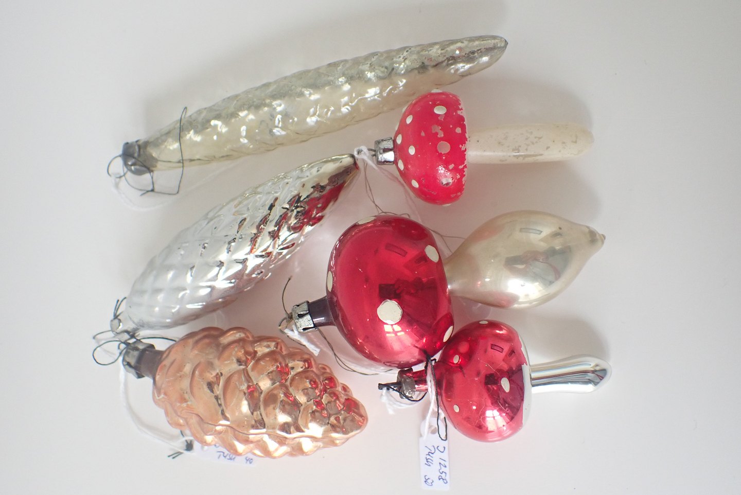3 stk. kogler. Med ophæng: 2 lange sølvfarvede russiske - 9,2 - 13 cm. og en bronzefarvet tysk, 8,2 cm. Omkring 1940. Priser fra 85 -200 kr. 3 paddehatte med rød, hvid og sølv bemaling. i forskellige størrelser. Priser fra. 85 - 200 kr.