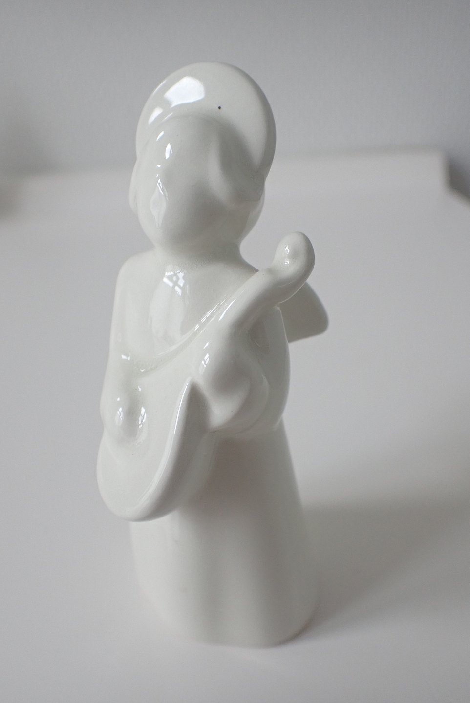 3 musikengle med bækken, fløjte og mandolin i fajance 2 fra Kgl. Porcelæn og 1 fra Aluminia. 1950 -erne. Højde: 9,5 cm. I Fin stand.