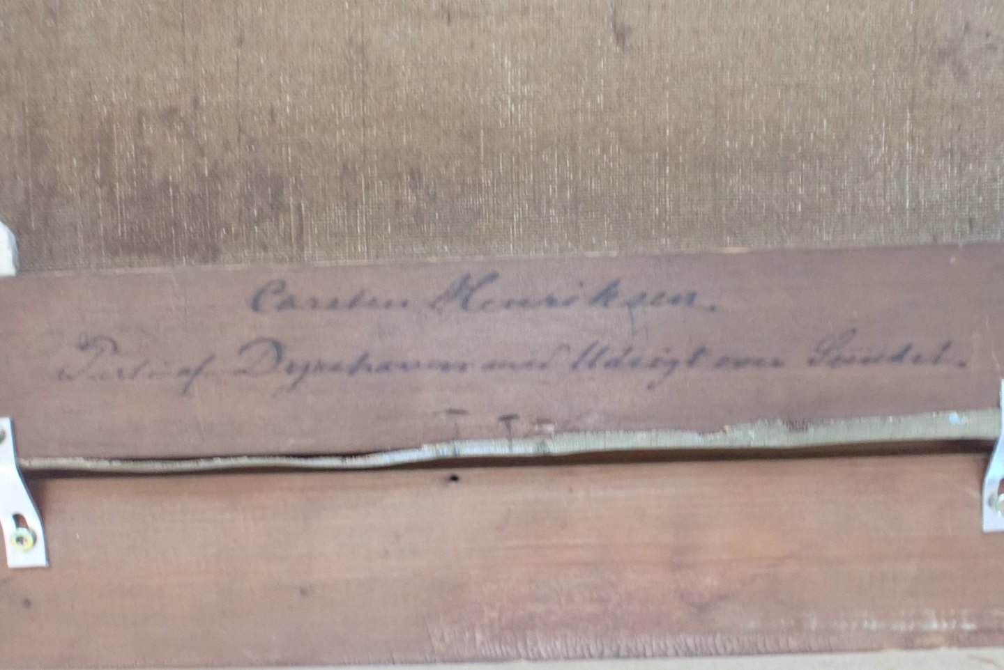 Carsten Hentichsen (1824 - 1897) - indrammet maleri. Olie på lærred. Signeret med initialer CH 1871. Fuld signeret på bagsiden med beskrivelse : "Parti af Dyrehaven med udsigt over Sundet".Børn i forgrunden. Formodentlig daværende udsigt over eksisterende hus nær strandvejen ved Springforbi. Mål: 29 x39 cm. med ramme: 39,5 x 49,5 cm. I fin nyrestaureret stand af professionel konservator.