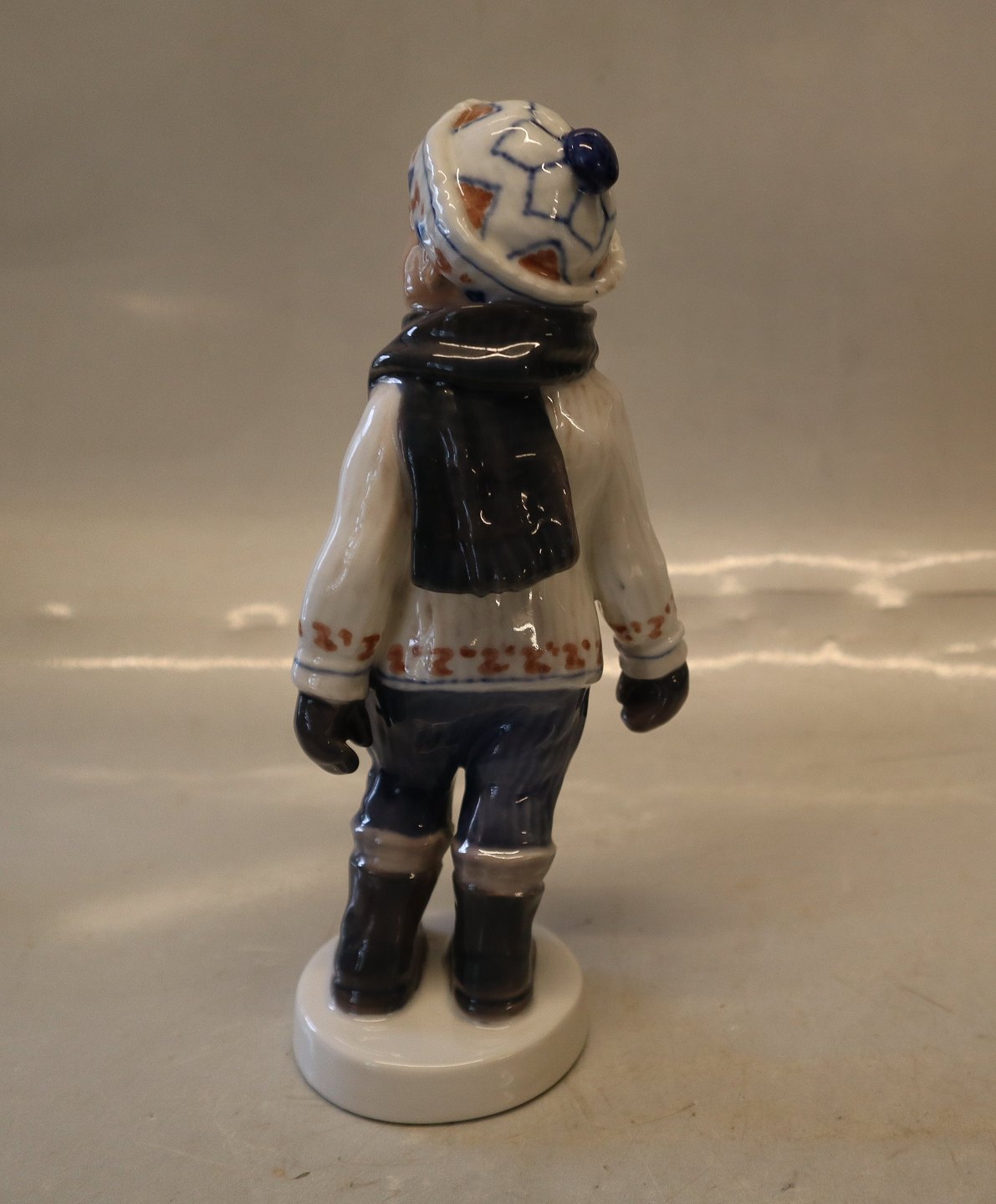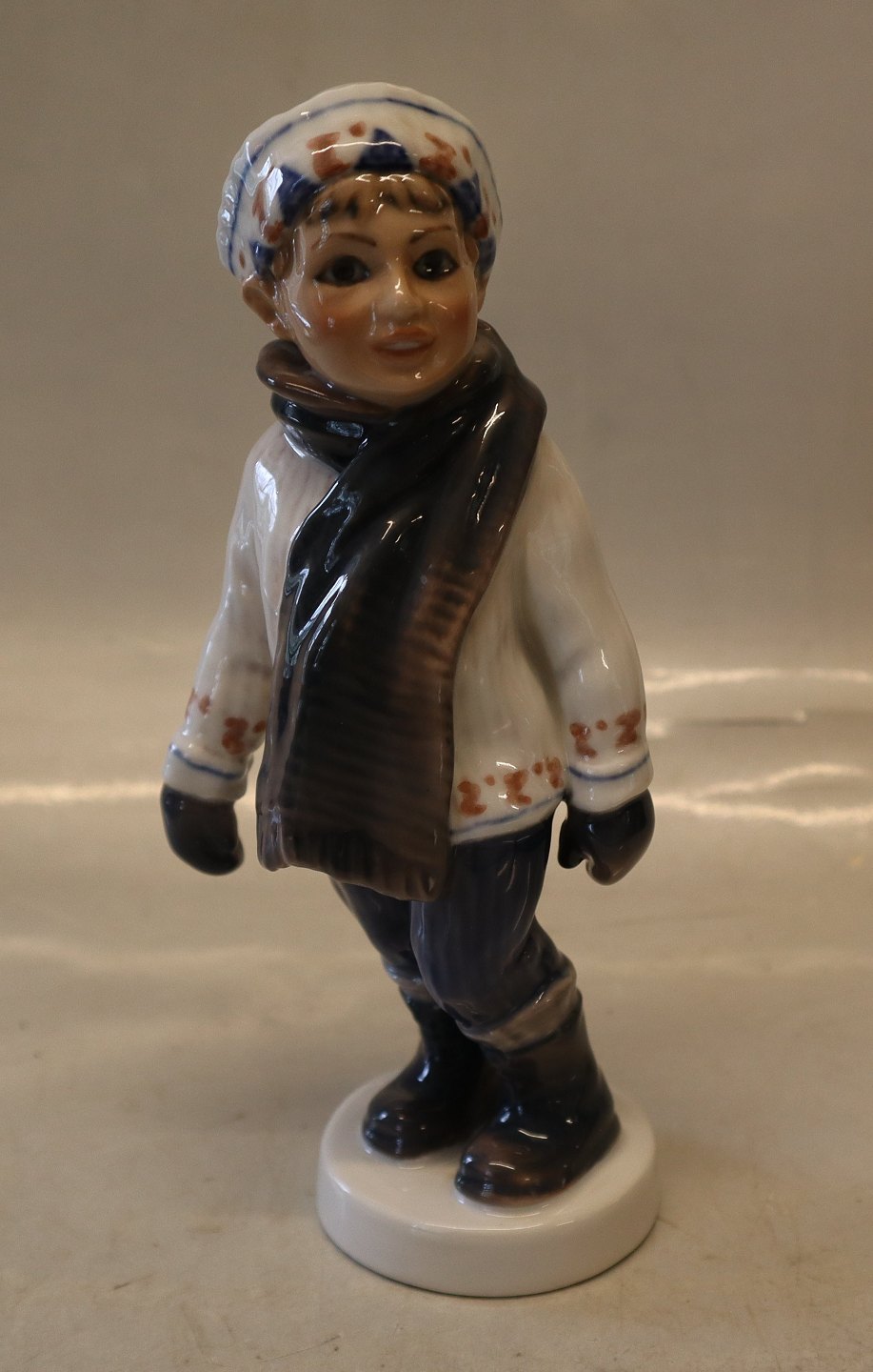 Dahl Jensen 1064 Dreng i vintertøj (DJ) 19,5 cm. Hue, handsker og halstørklæde Mærket med kongelig krone og DJ Copenhagen i hel og fin stand.