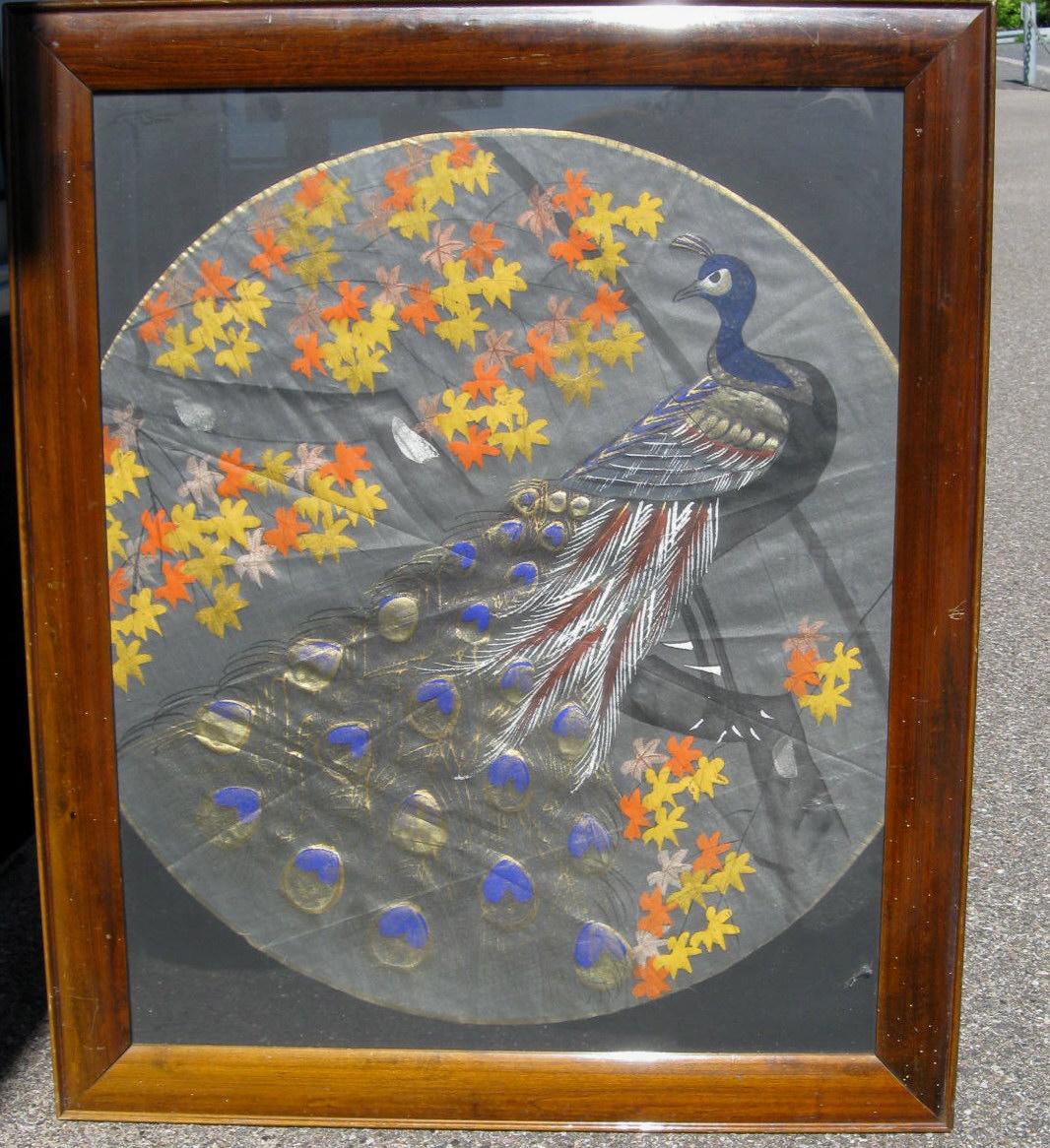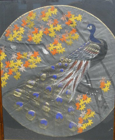 Japansk silkemaleri med påfugl, sidende på en gren. 19. årh. Polykrom dekoration. 70 x 55 cm. Med lakeret fyrretræs ramme.