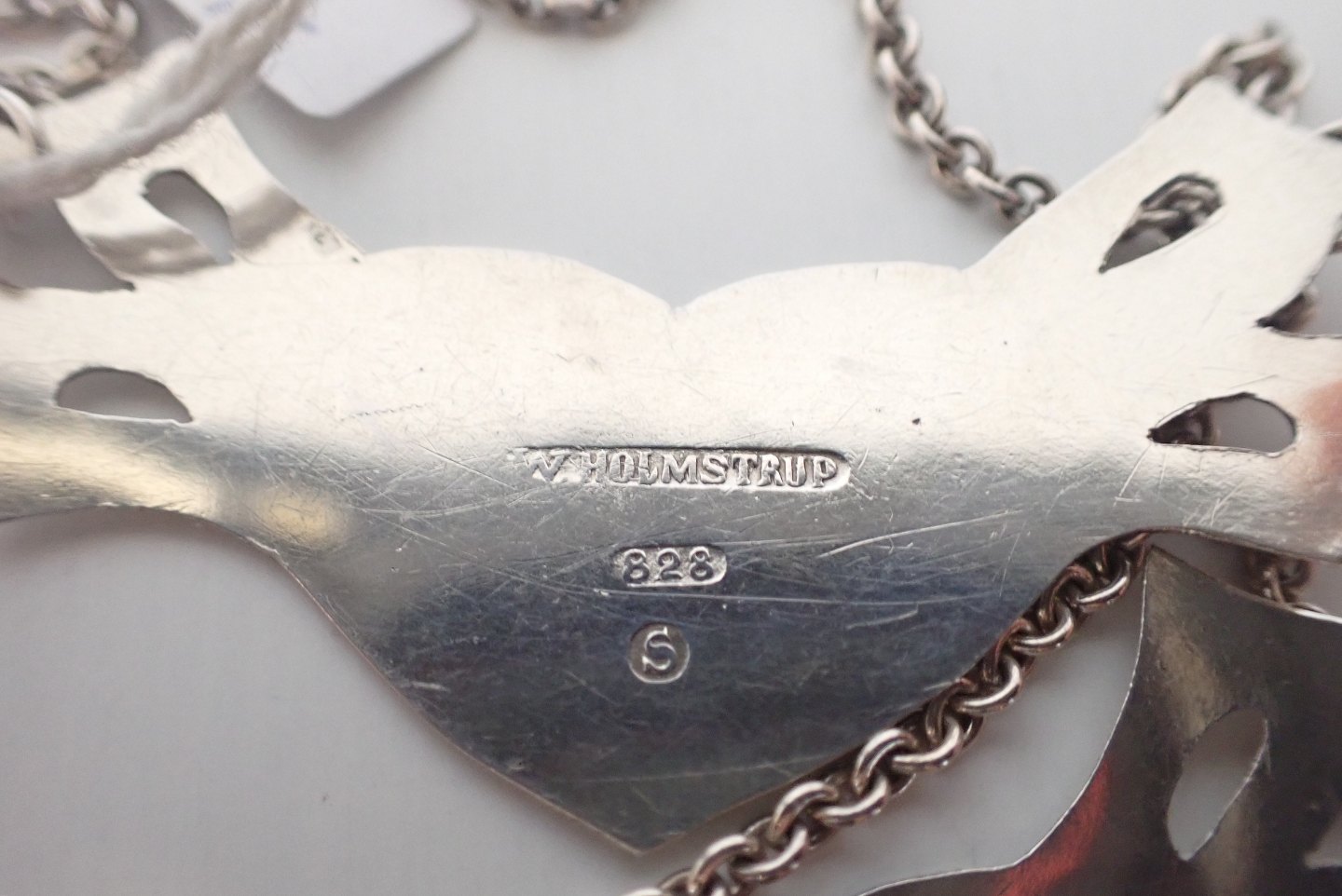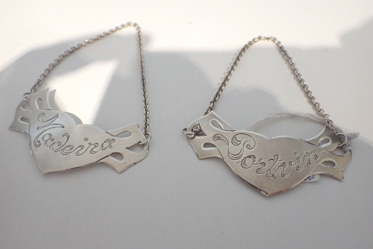 Et par danske vinskilte - portvin og madeira - i sølv udført af V.Holmstrup, Kbh. (1937 - 1976). 828 sølv. Bredde: 2,3 cm. Vægt par: 9,8 gram. kr. Solgt.