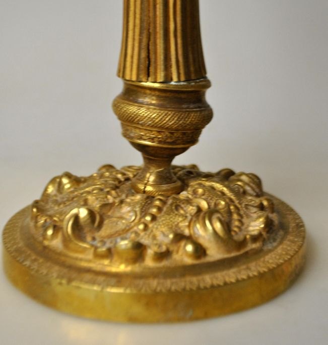 Paar Französisch Kerzenleuchter aus Messing / Bronze, vergoldet, 19. Jahrhundert. Fuß mit Rokoko Dekoration und Stam. H: 24 cm.