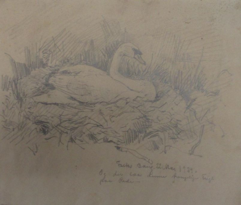Bang, Falke (1912 - 1998) Dänemark: Ein Schwan auf dem Nest. Bleistift auf Papier. Unterzeichnet: Falke Bang, den 22. Mai 1939 16,5 x 20 cm. Mit dem Text: "Und Sie legen diese königlichen Vogel im Nest." Ungerahmt.