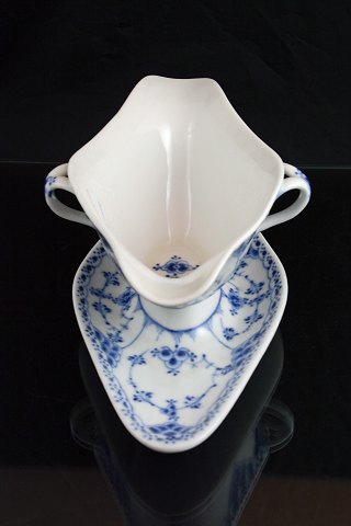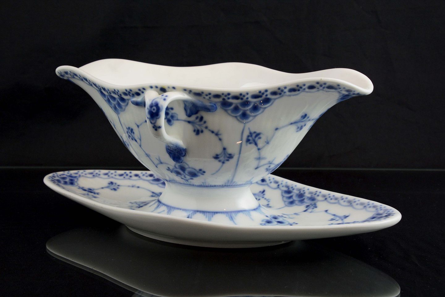 Text zugänglich auf Dänische: Saucekande med hanke (nr. 1/585) Kgl. halvblonde musselmalet fra Royal Copenhagen. 1. sort. Intakt.