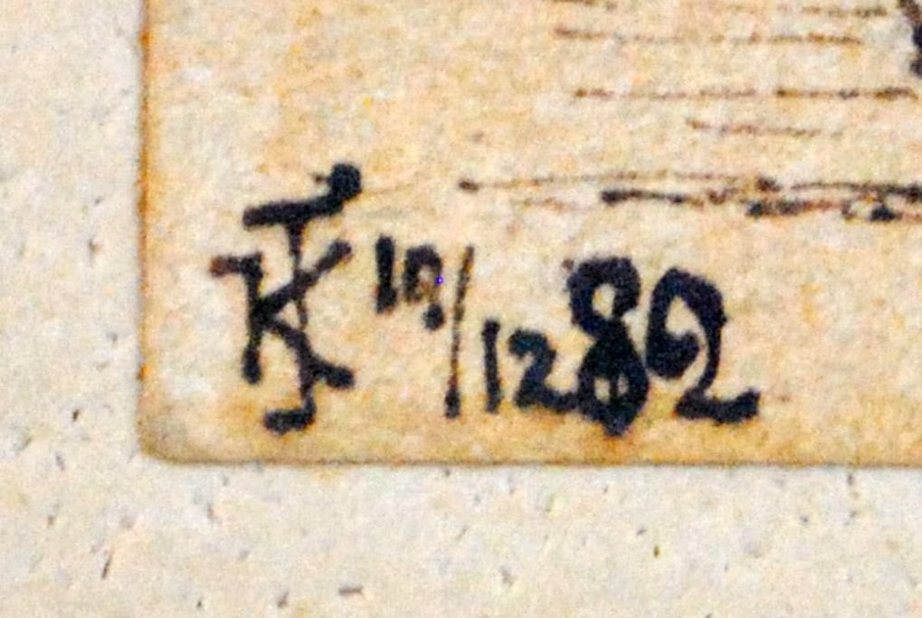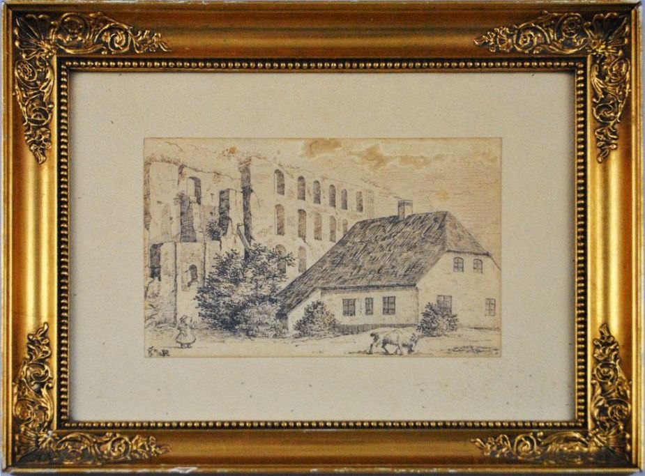 Jensen, Karl Georg (1851–1933), Dänemark. Ein kleines Mädchen in Koldinghus. Tusche auf Papier. Signiert: Monogramm KJ, 19. 12. 82. 18 x 12 cm. Mit einem eckverzierten Rahmen versehen. Die Zeichnung stammt wahrscheinlich aus der Weihnachtszeit und war ein Geschenk, da das Motiv aus dem Sommer stammt.