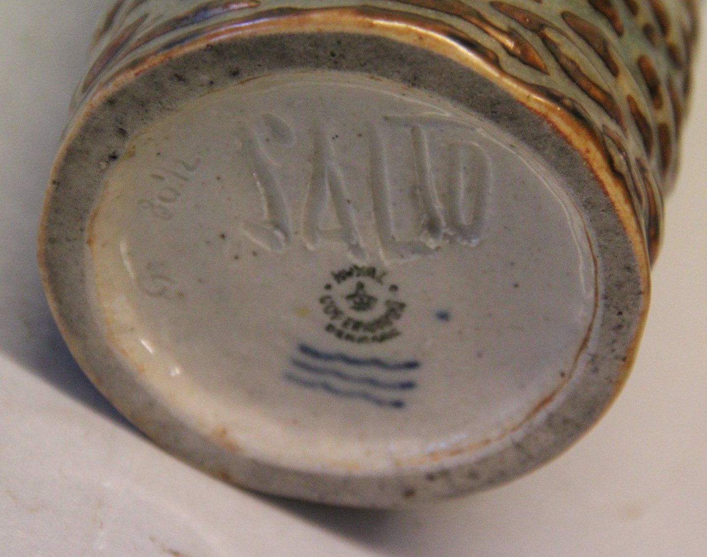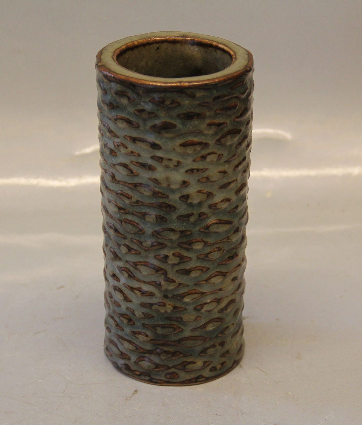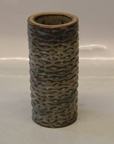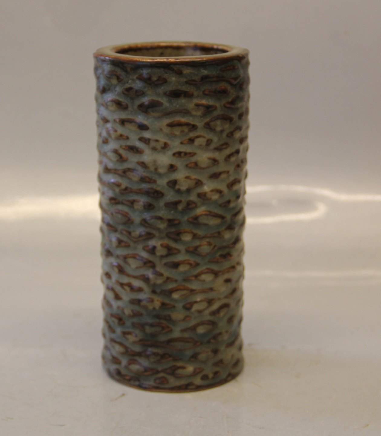 Axel Salto (1889-1961) for Royal Copenhagen Stentøj. Saltovase i Cylindrisk, vertikalt knopret i relief 17 x 8 cm med 23 vertikale rækker ovale / rombeformede knopper, grønbrun glasur. Betegnet Salto Produktionsår 1949 streg over N i Copenhagen og tre bølgelinier. Utydeligt nummereret men højst sandsynligt # Kgl. 20565. Men den er lidt større og anderledes varieret i mønsteret. Så det kan være et unika der ikke er ført til katalogs. Præget Nr 80½ i godset og et utydelig bogstav. 1 sortering I perfekt stand