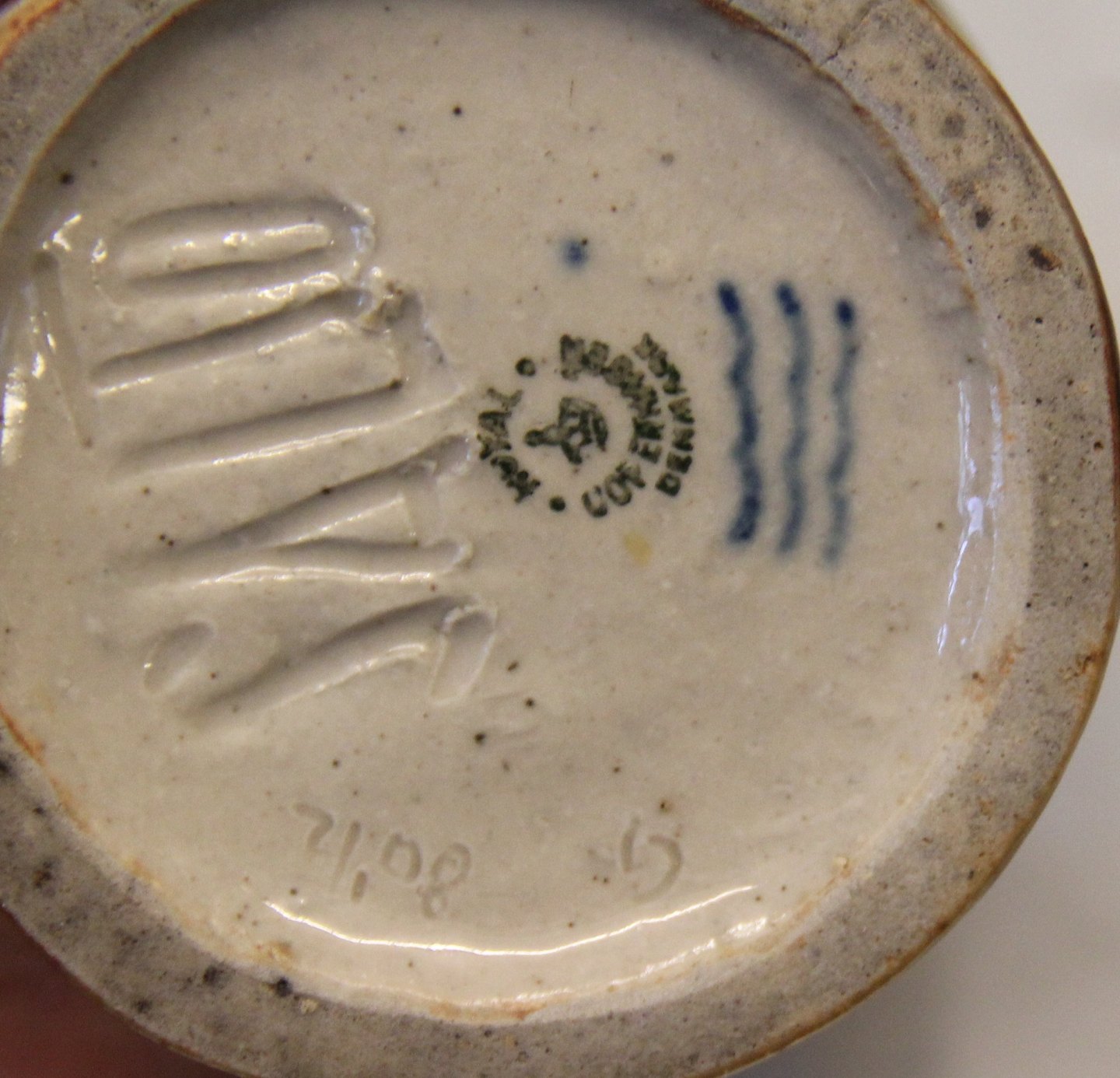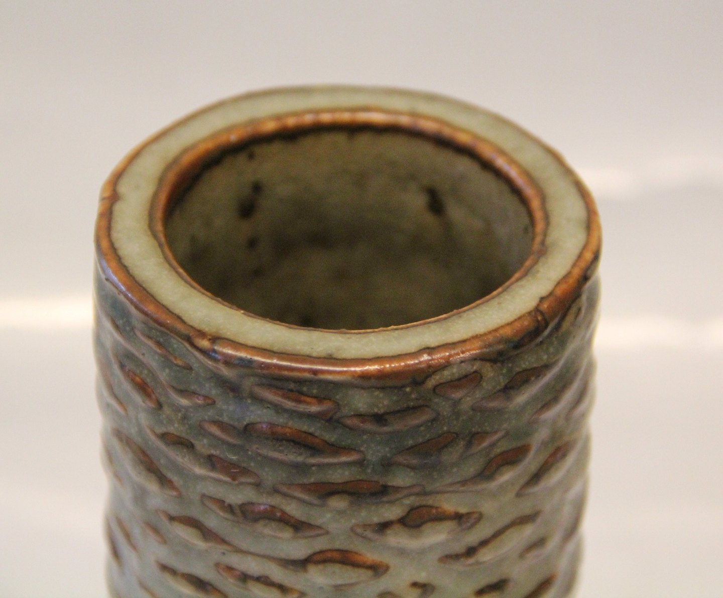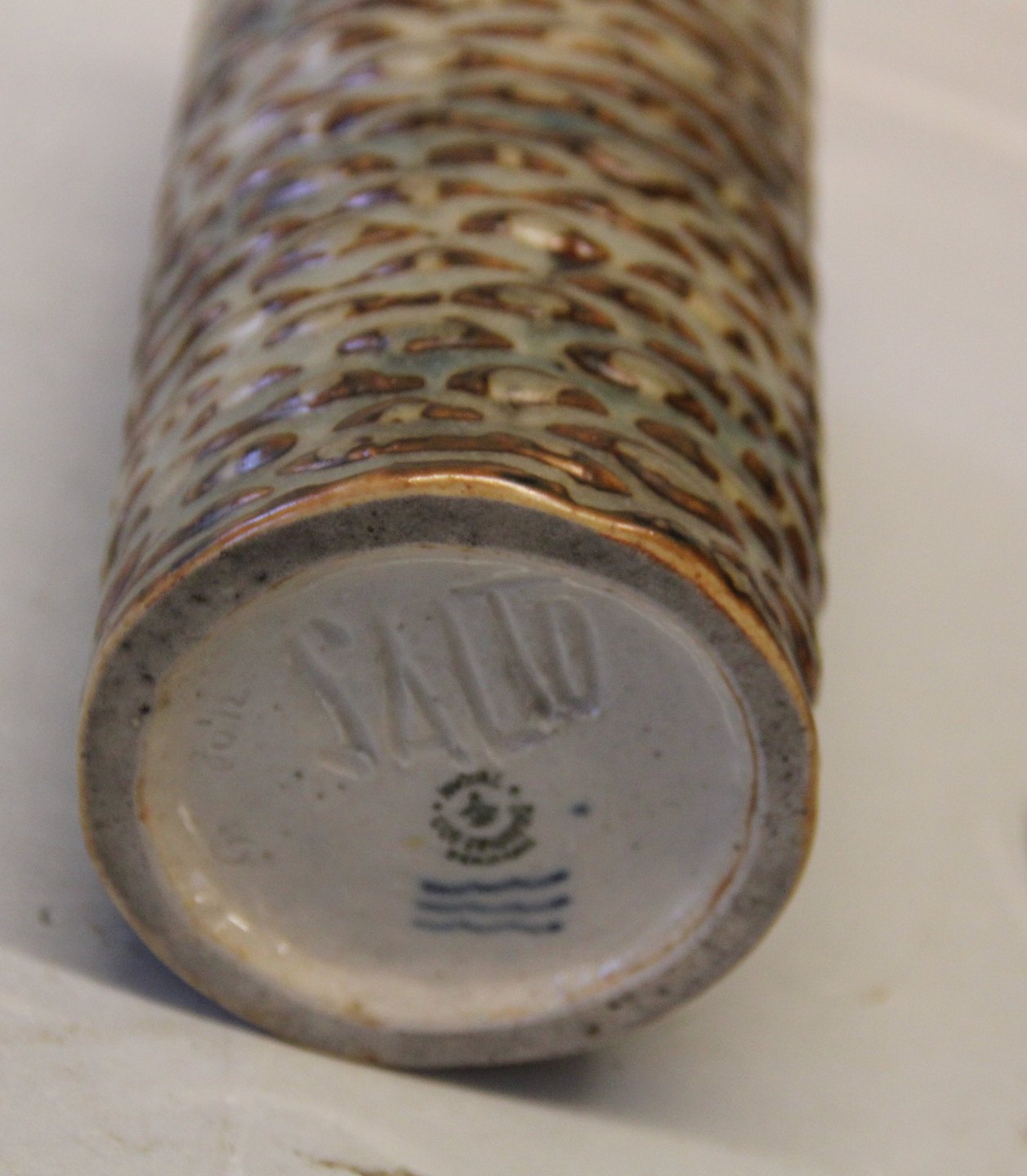 Axel Salto (1889-1961) for Royal Copenhagen Stentøj. Saltovase i Cylindrisk, vertikalt knopret i relief 17 x 8 cm med 23 vertikale rækker ovale / rombeformede knopper, grønbrun glasur. Betegnet Salto Produktionsår 1949 streg over N i Copenhagen og tre bølgelinier. Utydeligt nummereret men højst sandsynligt # Kgl. 20565. Men den er lidt større og anderledes varieret i mønsteret. Så det kan være et unika der ikke er ført til katalogs. Præget Nr 80½ i godset og et utydelig bogstav. 1 sortering I perfekt stand
