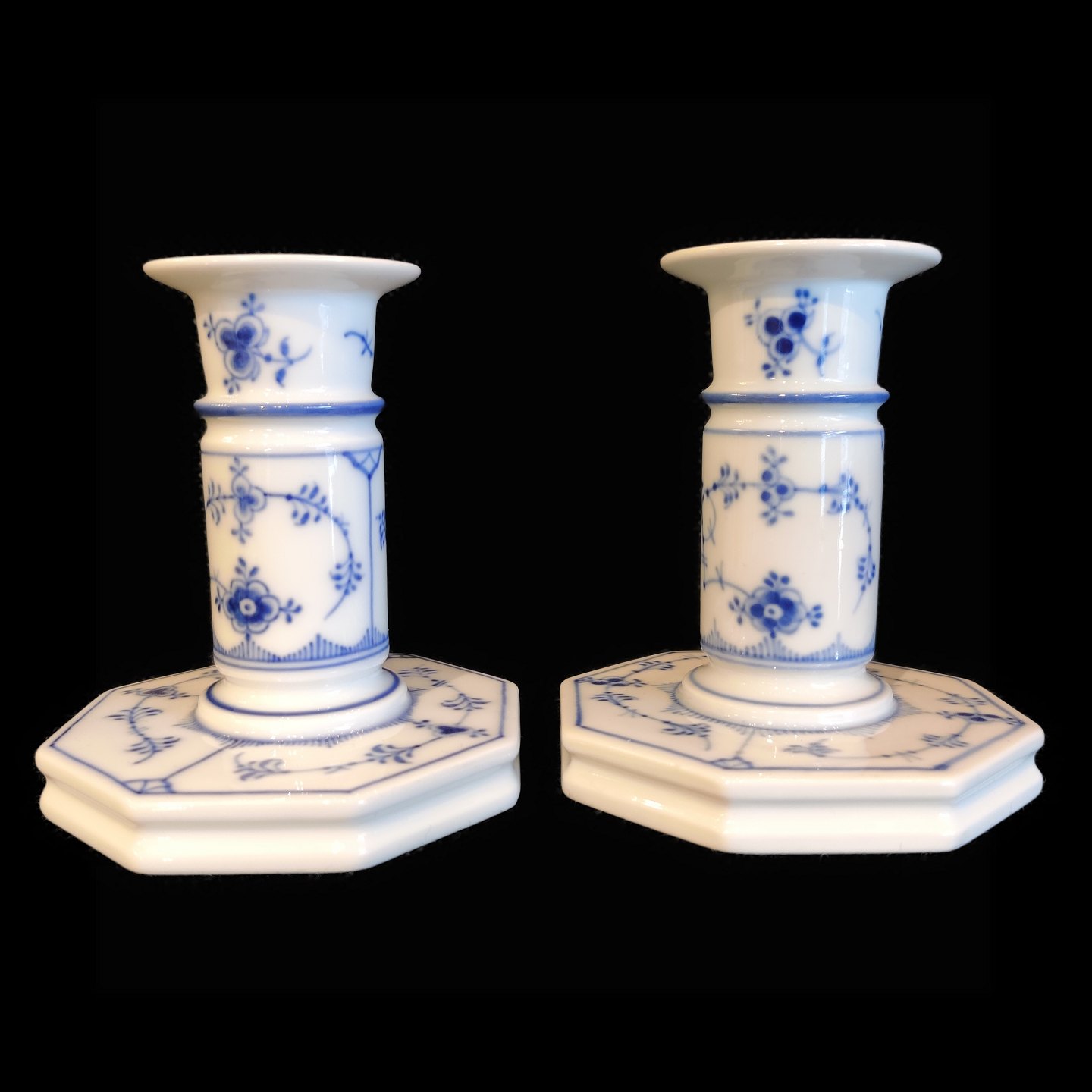 Text zugänglich auf Dänische: Royal Copenhagen, musselmalet riflet; Par lysestager i porcelæn #3303