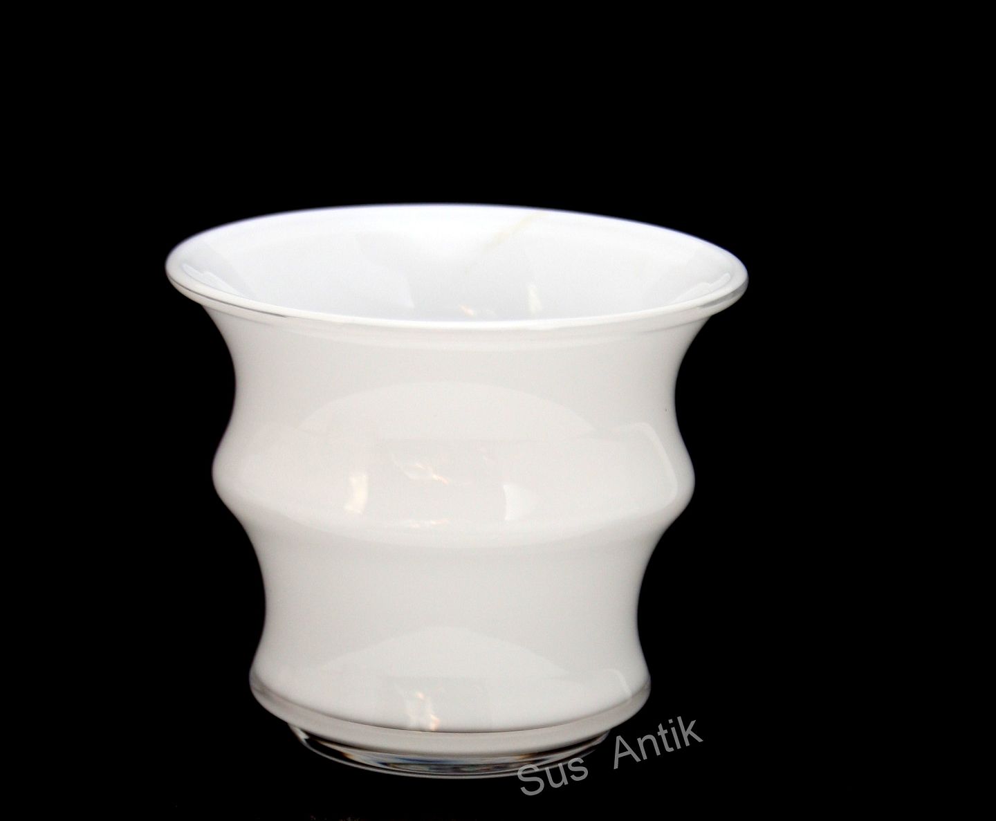 Text zugänglich auf Dänische: Holmegaard, Karen Blixen, hvid opaline fyrfadsstage kan også bruges som mini urtepotteskjuler. Designet af Anja Kjær i 2000. Formen er inspireret af afrikanske kvinders hals og armringe. Sigeret Anja Kjær Holmegaard. Højde ca. 7 cm. Diameter ca. 8,5 cm. Pris: 200 kr. stk. Lager: 1