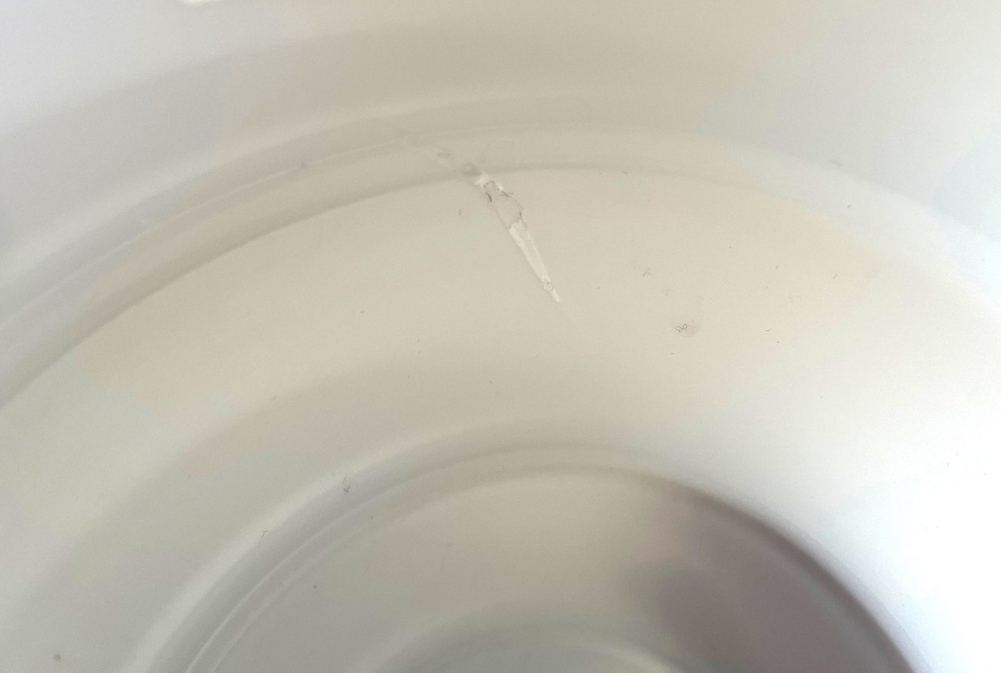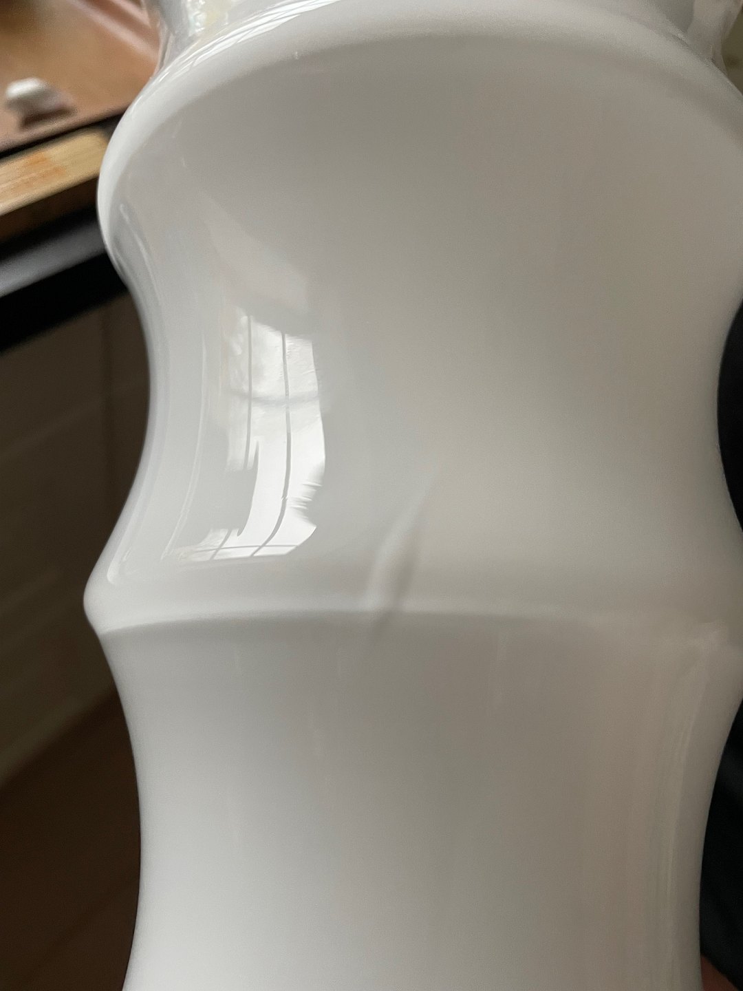 Text zugänglich auf Dänische: Holmegaard, Karen Blixen opalinehvid vase stor størrelse. Designet af Anja Kjær i 2000. Vasens form er inspireret af afrikanske kvinders hals og armringe. Højde 30,5 cm. Diameter 17,5 cm. OBS der er 2 indvendige produktionsfejl. Den øverste som en revne i glasset, den nederste som en boble, den kan ses udefra. Pris: 400 kr. stk. Lager: 1