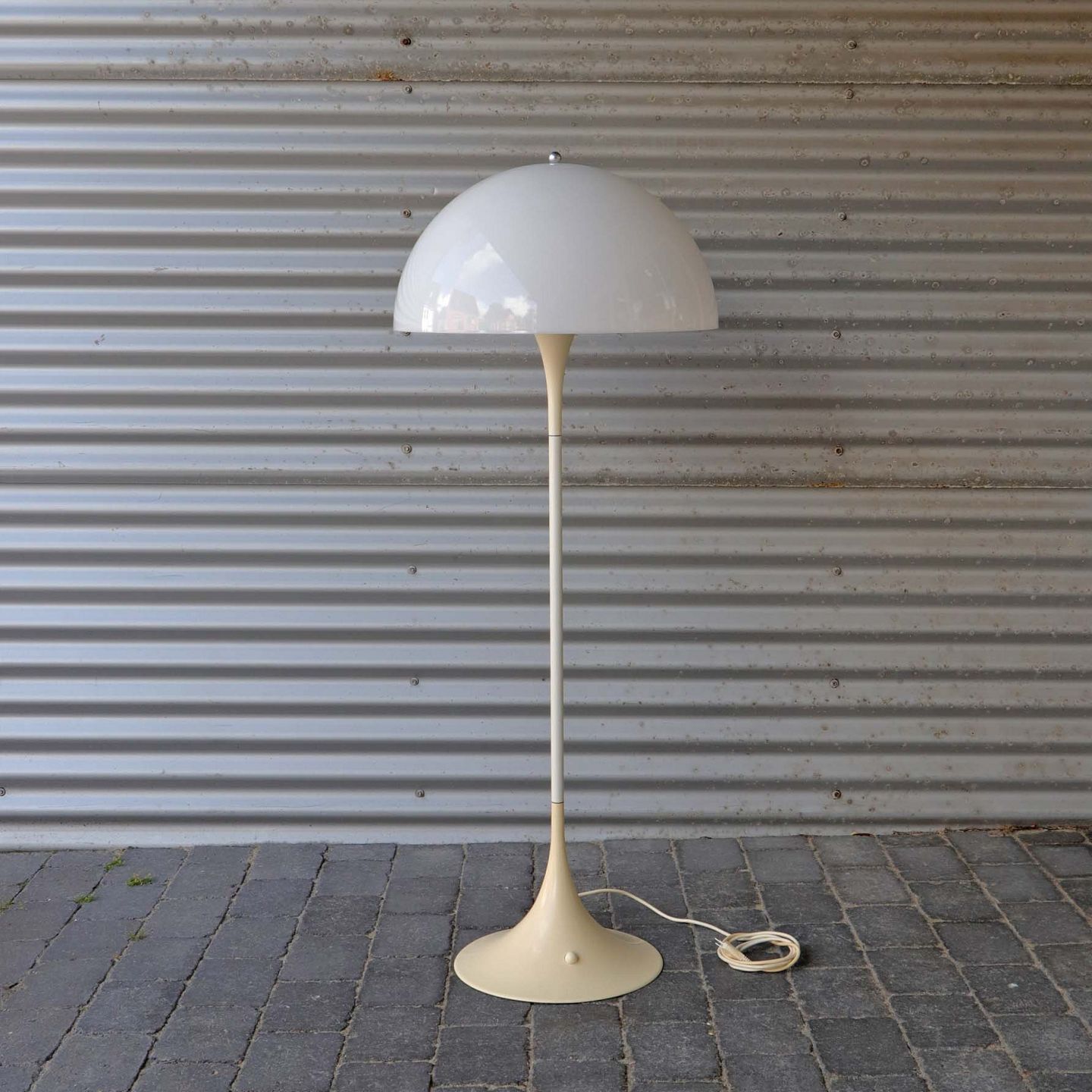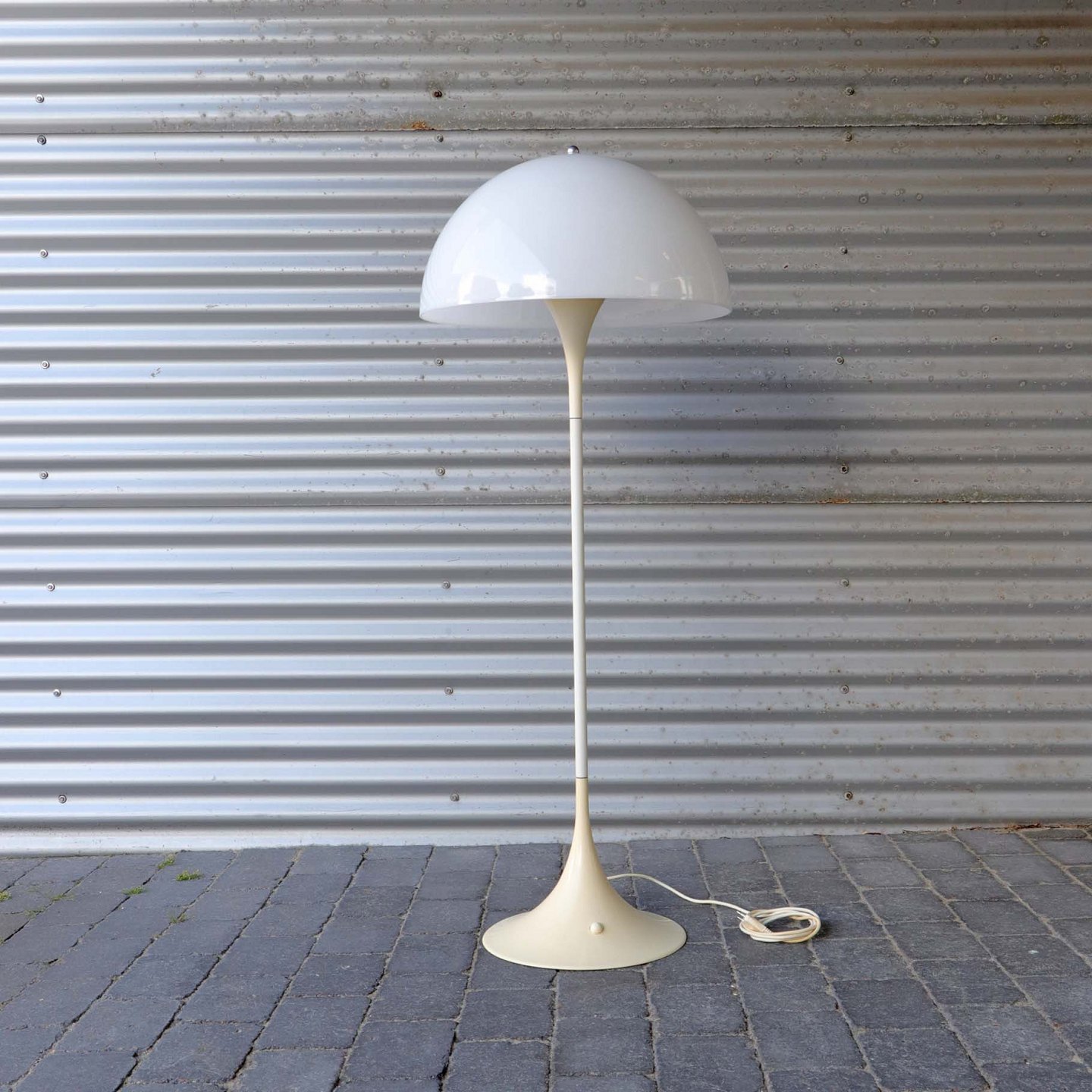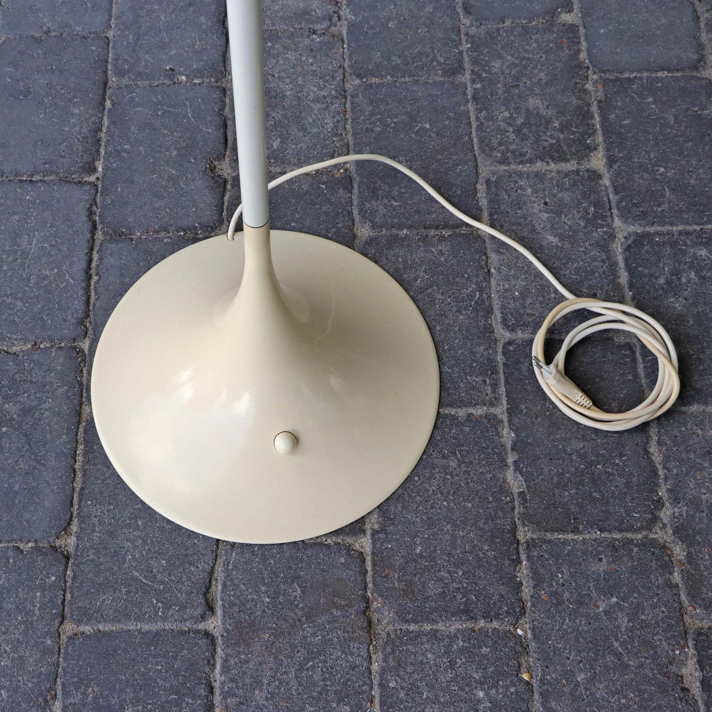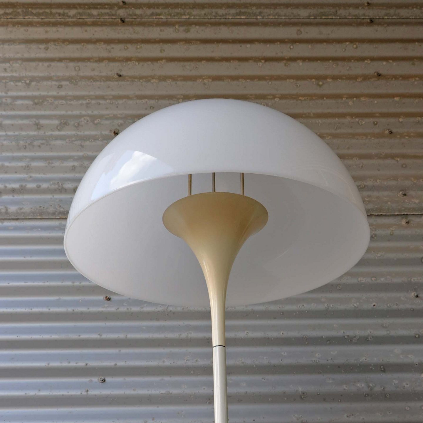 Panthella standerlampe i hvidlakeret metal og hvid plastskærm.