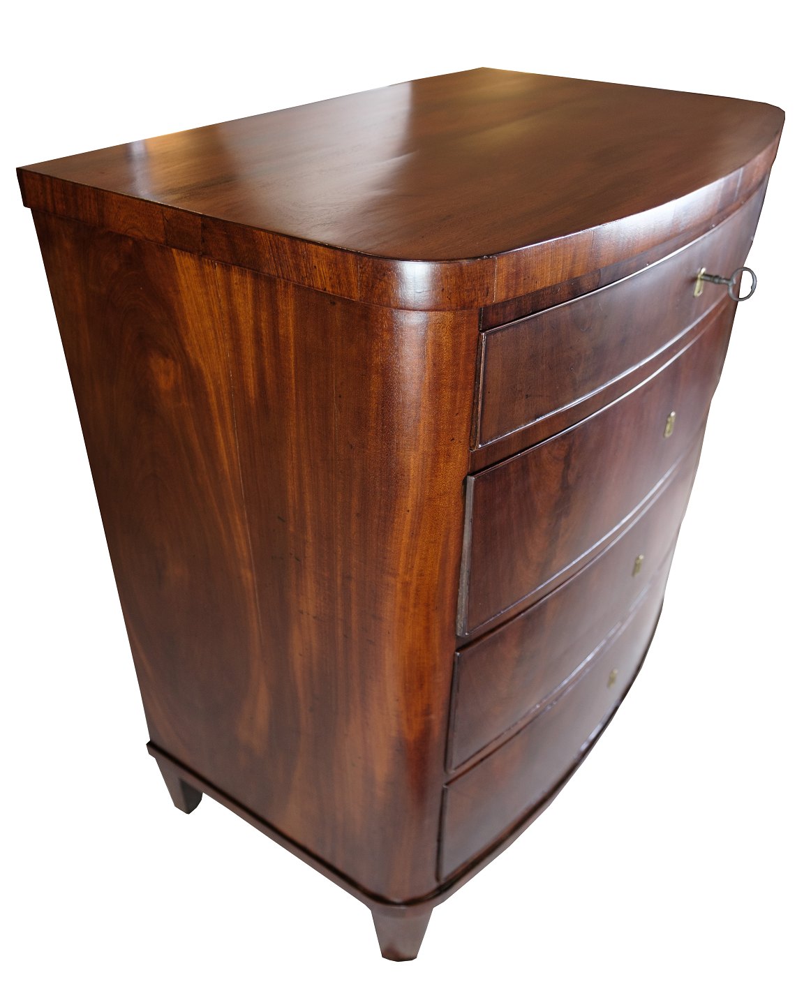 En Empire kommode af poleret mahogni med en buende front fra omkring 1820'erne er et fantastisk eksempel på klassisk og elegant møbeldesign fra den tidlige 1800-tallet.