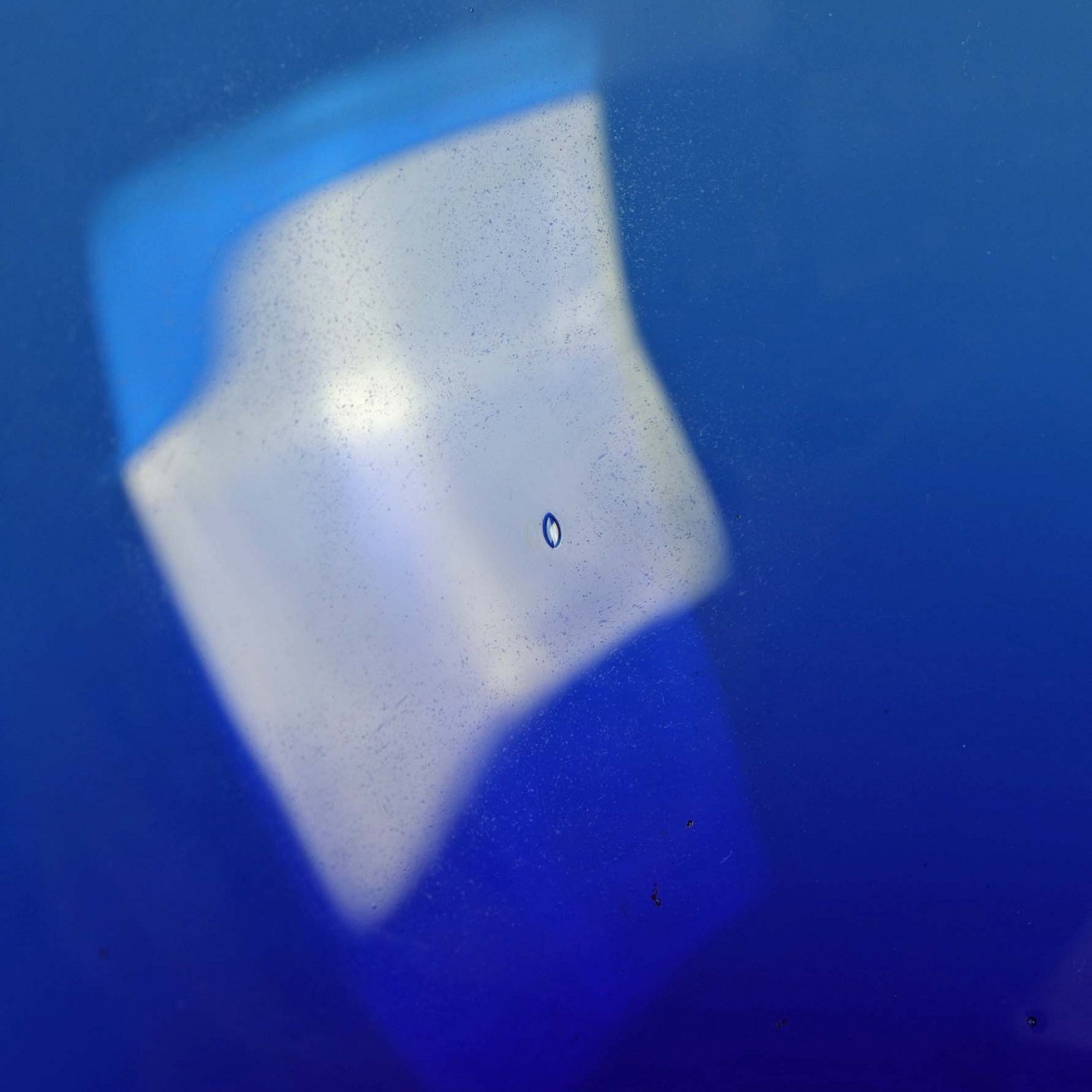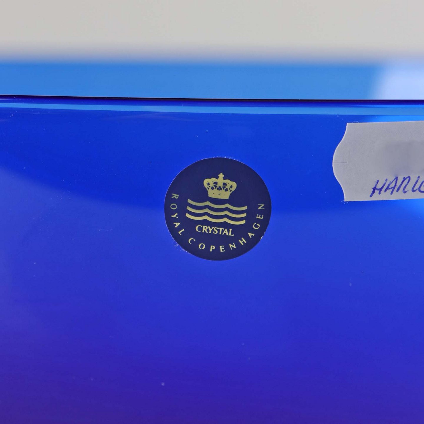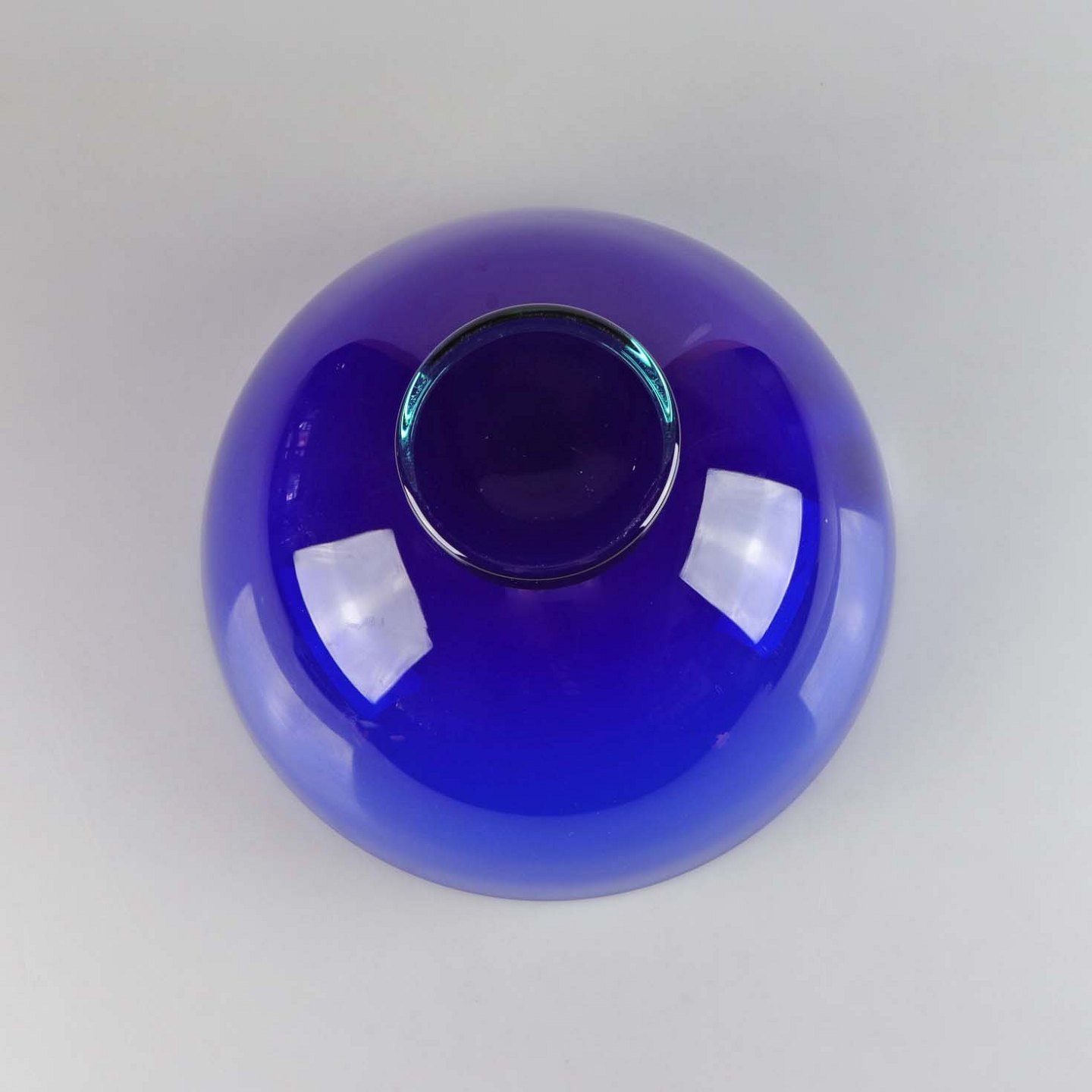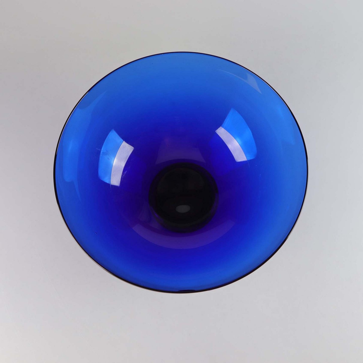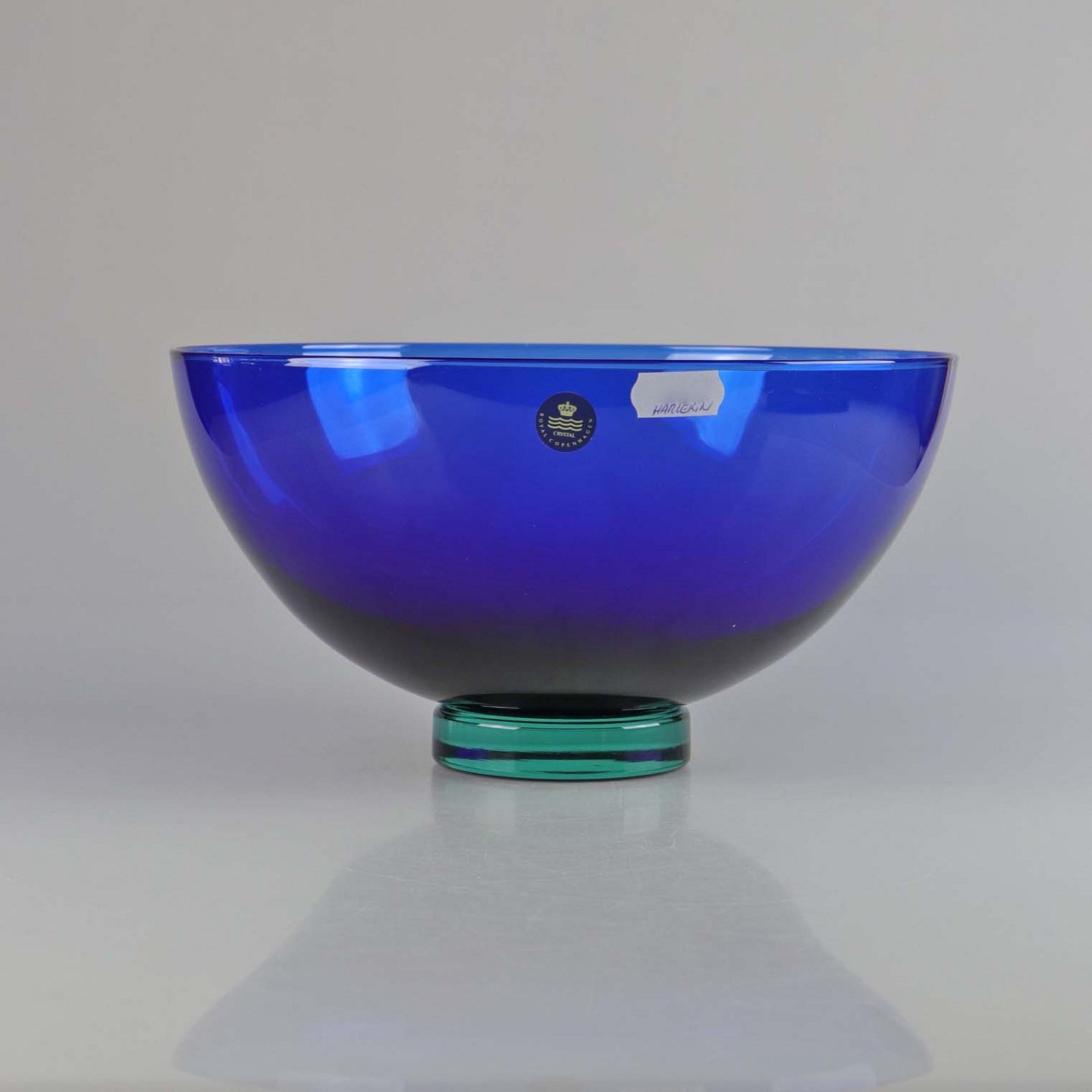 Skål af mundblæst blåt glas på klar grøn fod fra serien Harlekin