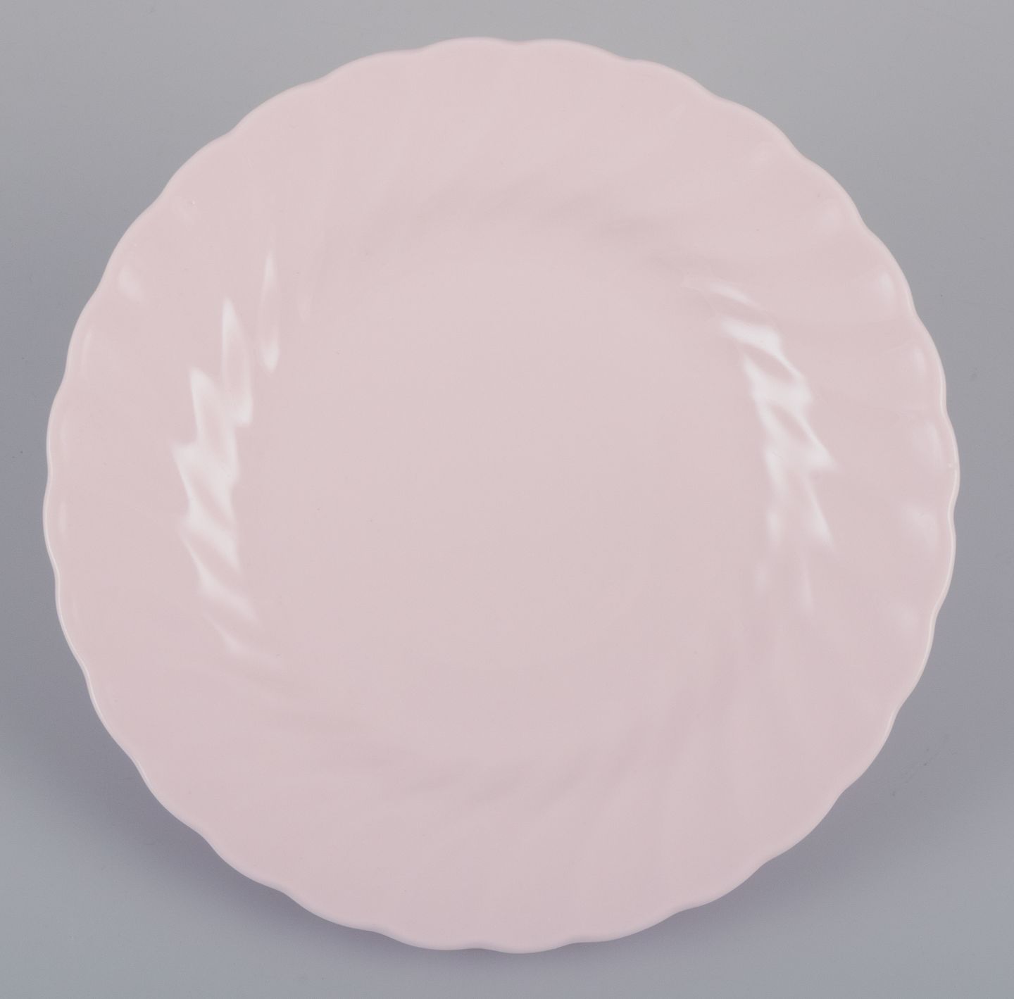 Tuscan, England. Seven plates in light pink porcelain with a wavy edge.