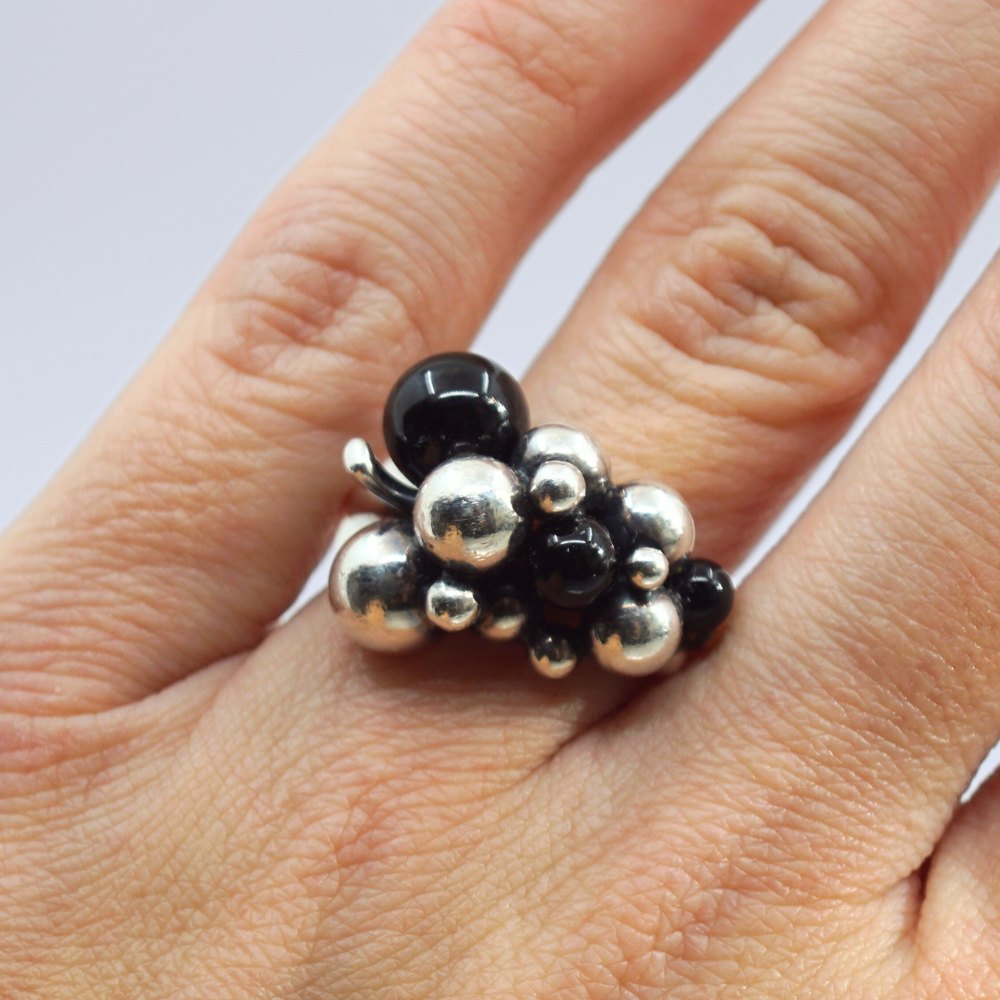Text zugänglich auf Dänische: Georg Jensen; Moonlight Grapes ring i sterlingsølv med sorte onyx kugler. Ring str. 52.