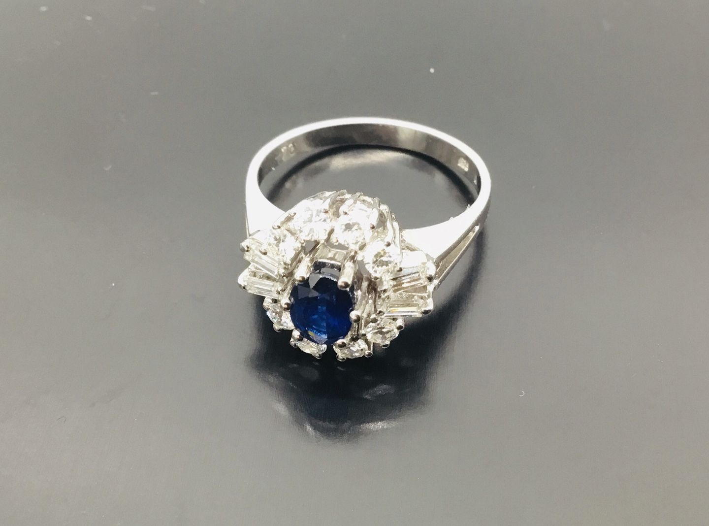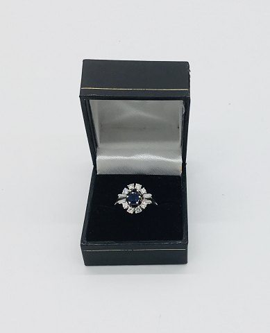 Ring i Hvidguld 585, 1Safir ca. 0,5 - 0,6 karat, 8 brillianter, 4 brillianter zus. 0,6 - 0,7 karat. Ringstr. 57.