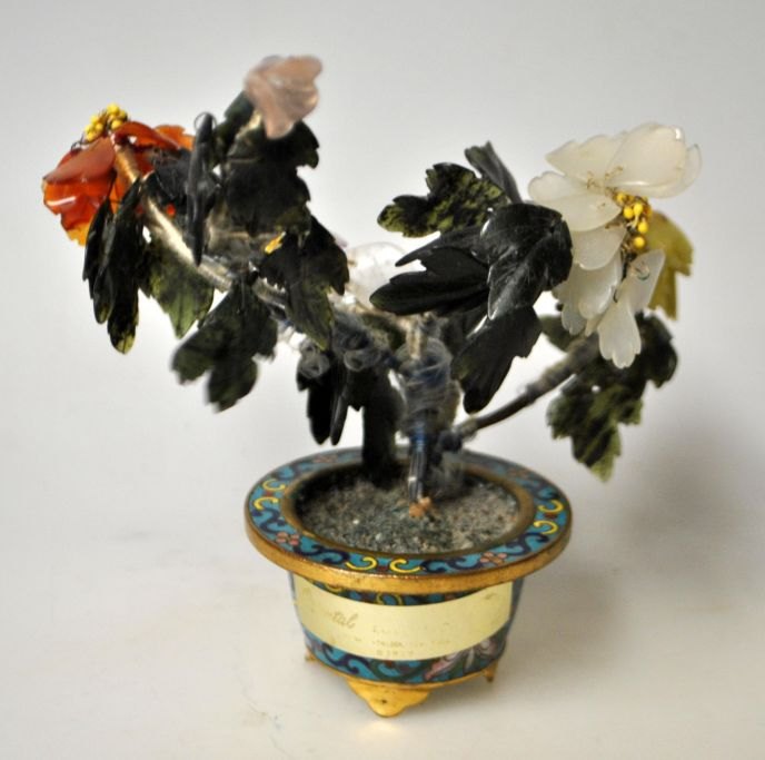 Chinesischer Jade Busch in einem Cloissonne-Becken, 20. Jahrhundert. Gestaltet als Busch mit verschiedenfarbigen Jaden in einem Cloissonne-Becken. Höhe: 13,5 cm.