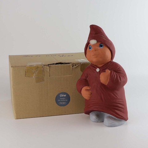 Klarborg figur af nissepigen Gine, som er iført rød nissehue og en lang rød natkjole.