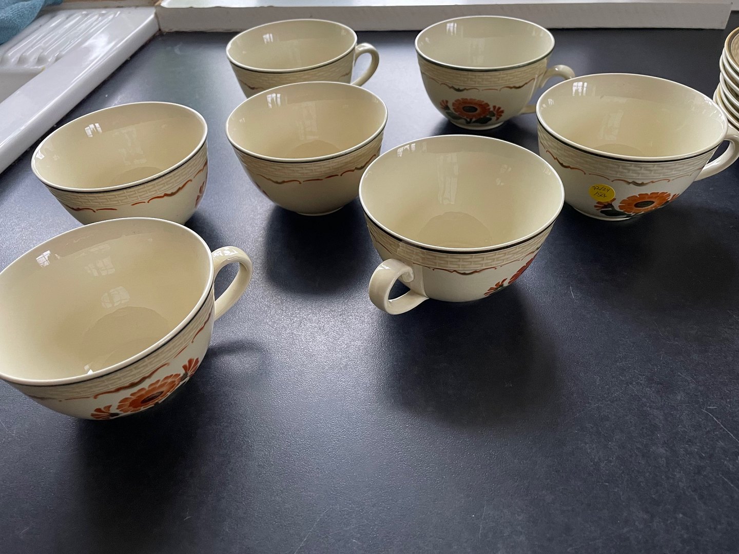 Text zugänglich auf Dänische: Aluminia, Morgenfrue. Designet af Niels Thorsson. Produceret i perioden 1934-1967. Luftmalet. Tekop. Nr. 1782. Højde 5,5 cm. Diameter 9,5 cm. Underkop diameter 15 cm. Flot stand. Pris: 150 kr. stk. Lager: 7