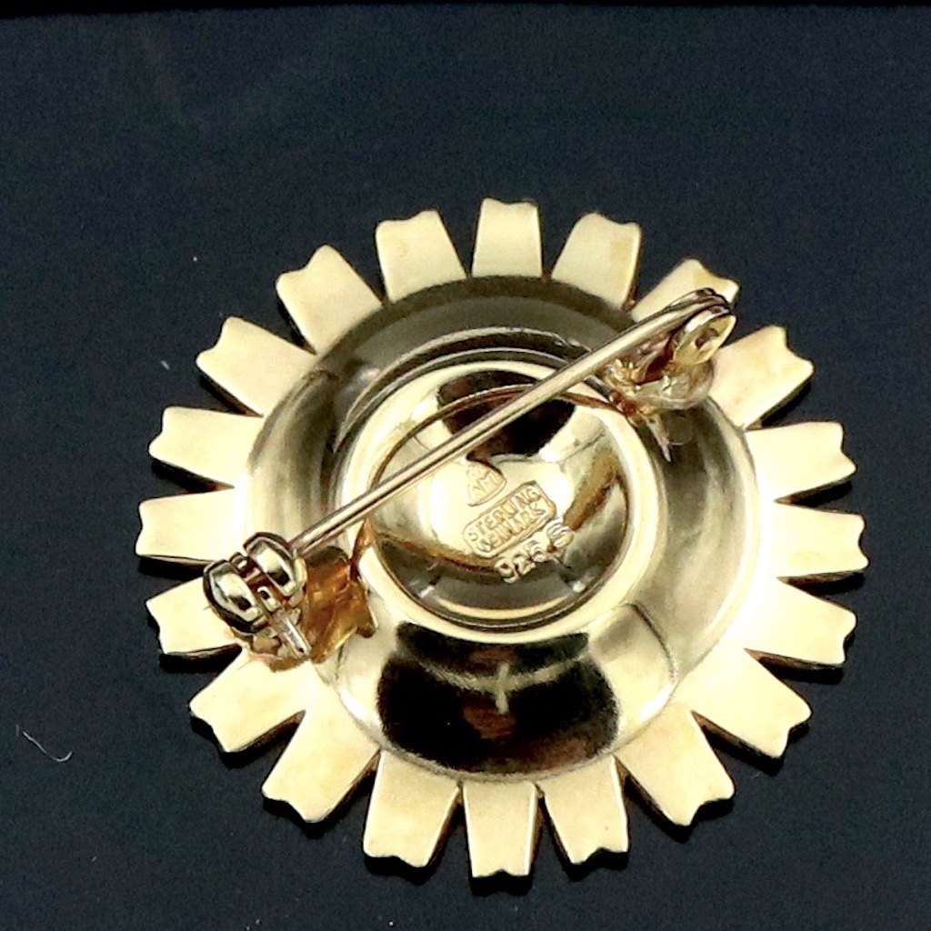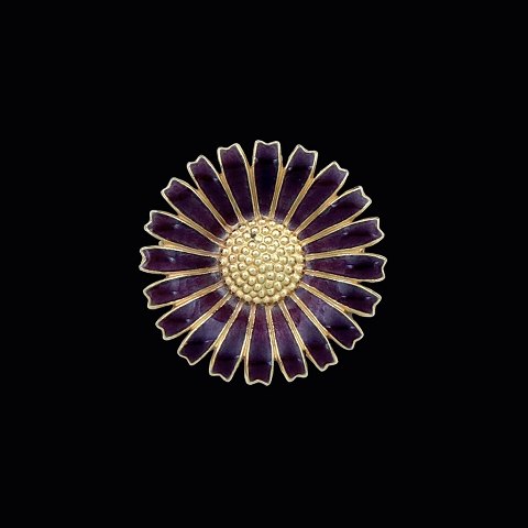 Text zugänglich auf Dänische: A. Michelsen Marguerit / Daisy Broche i forgyldt sterling sølv med lilla emalje - 33mm.