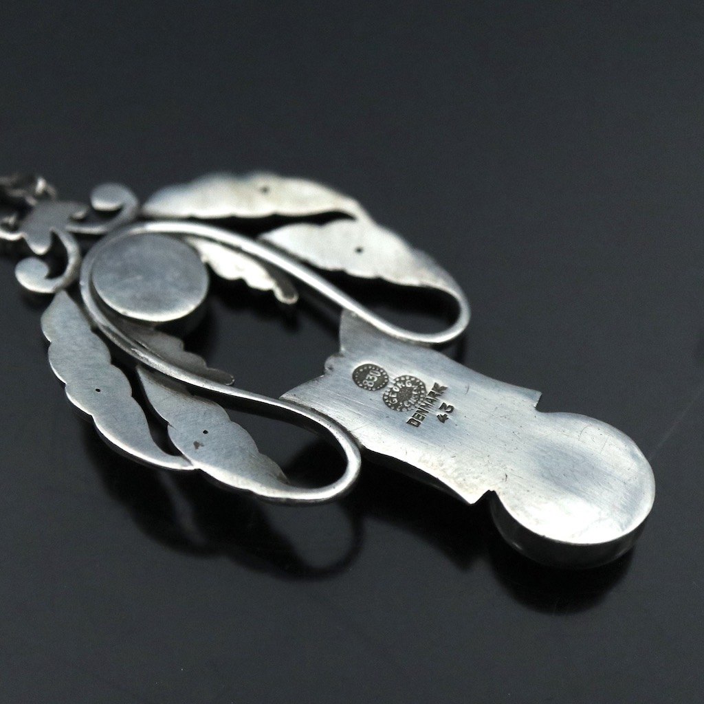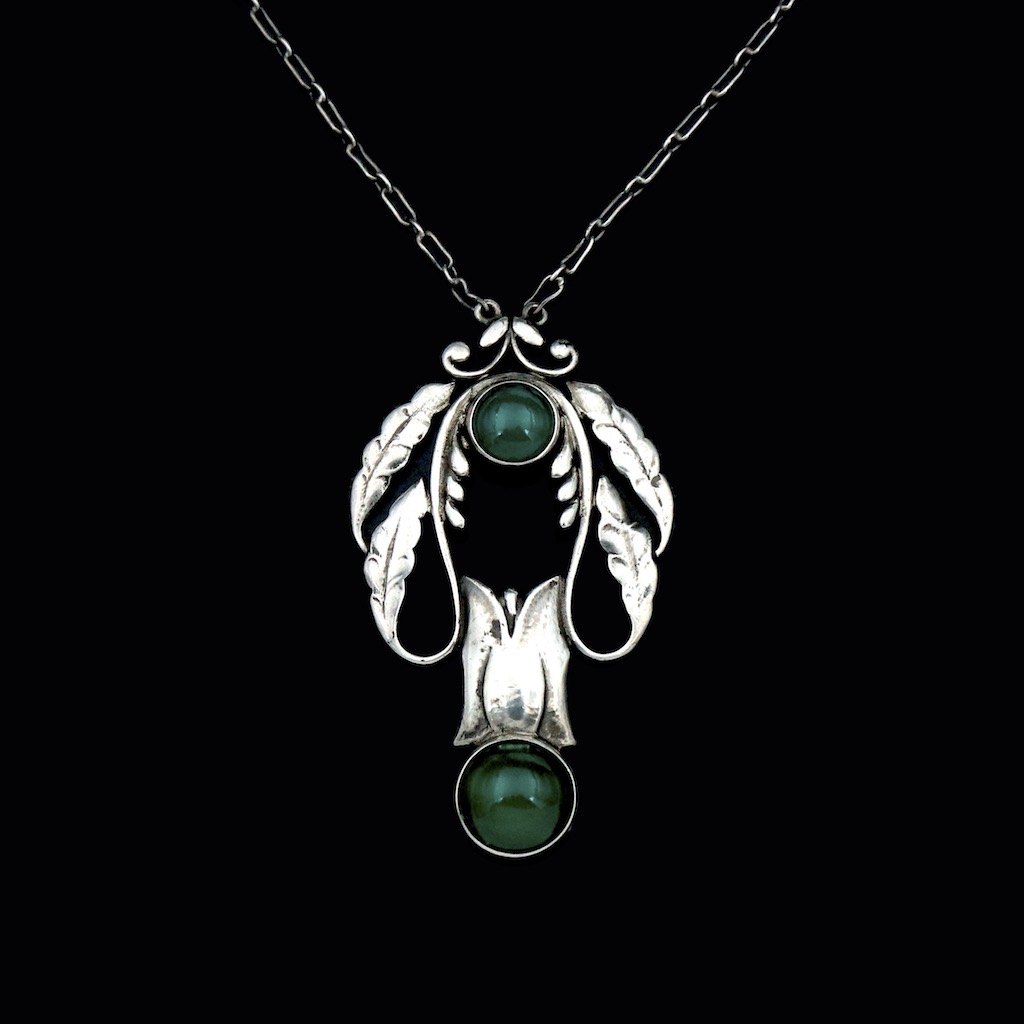 Text zugänglich auf Dänische: Georg Jensen. Vedhæng i sølv med grøn agat #43.