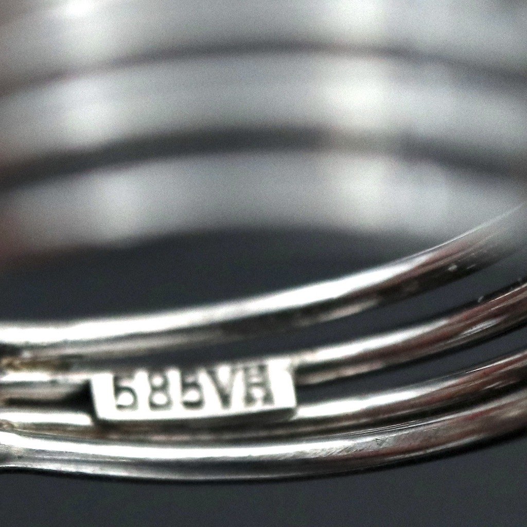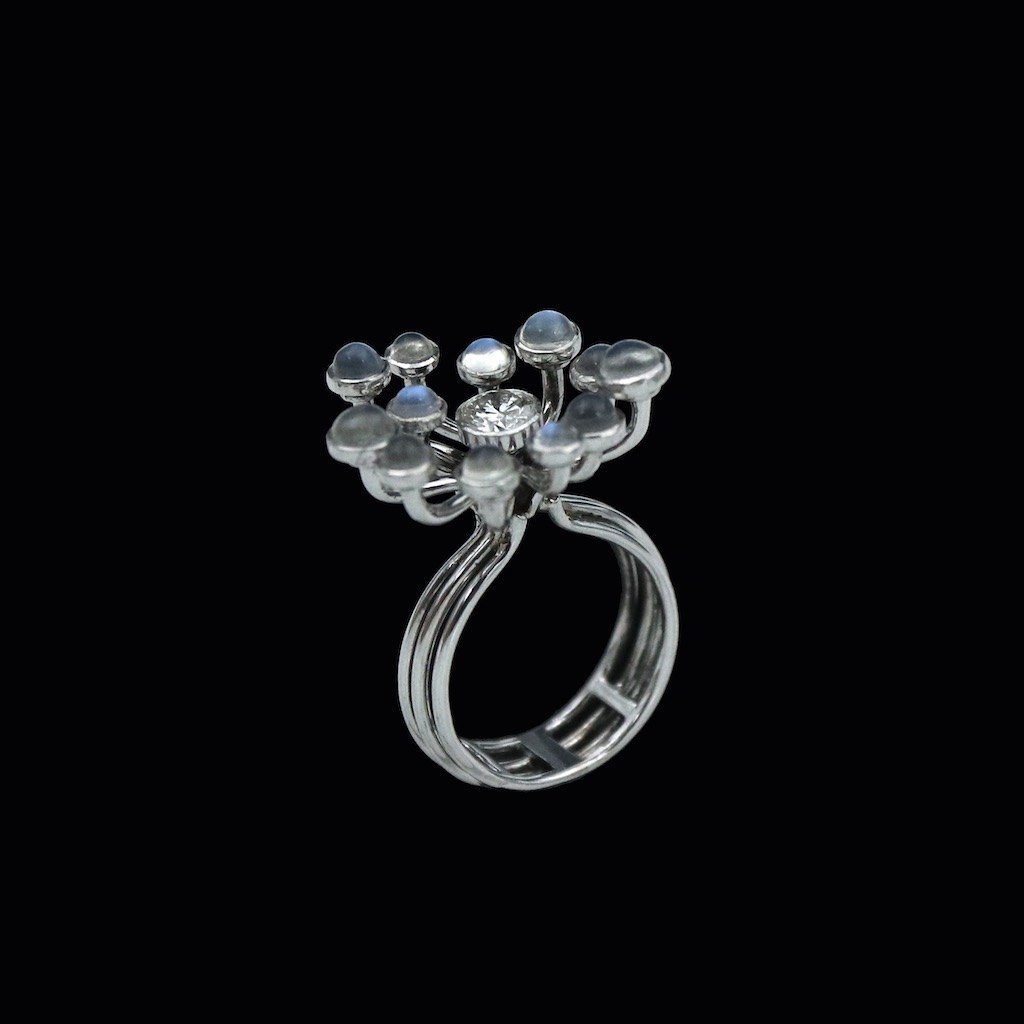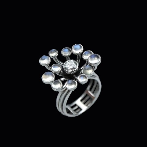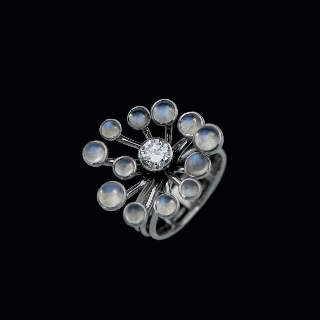 Text zugänglich auf Dänische: Vilhelm Holmstrup. Ring i 14k hvidguld med månesten og 0,47 ct diamant.