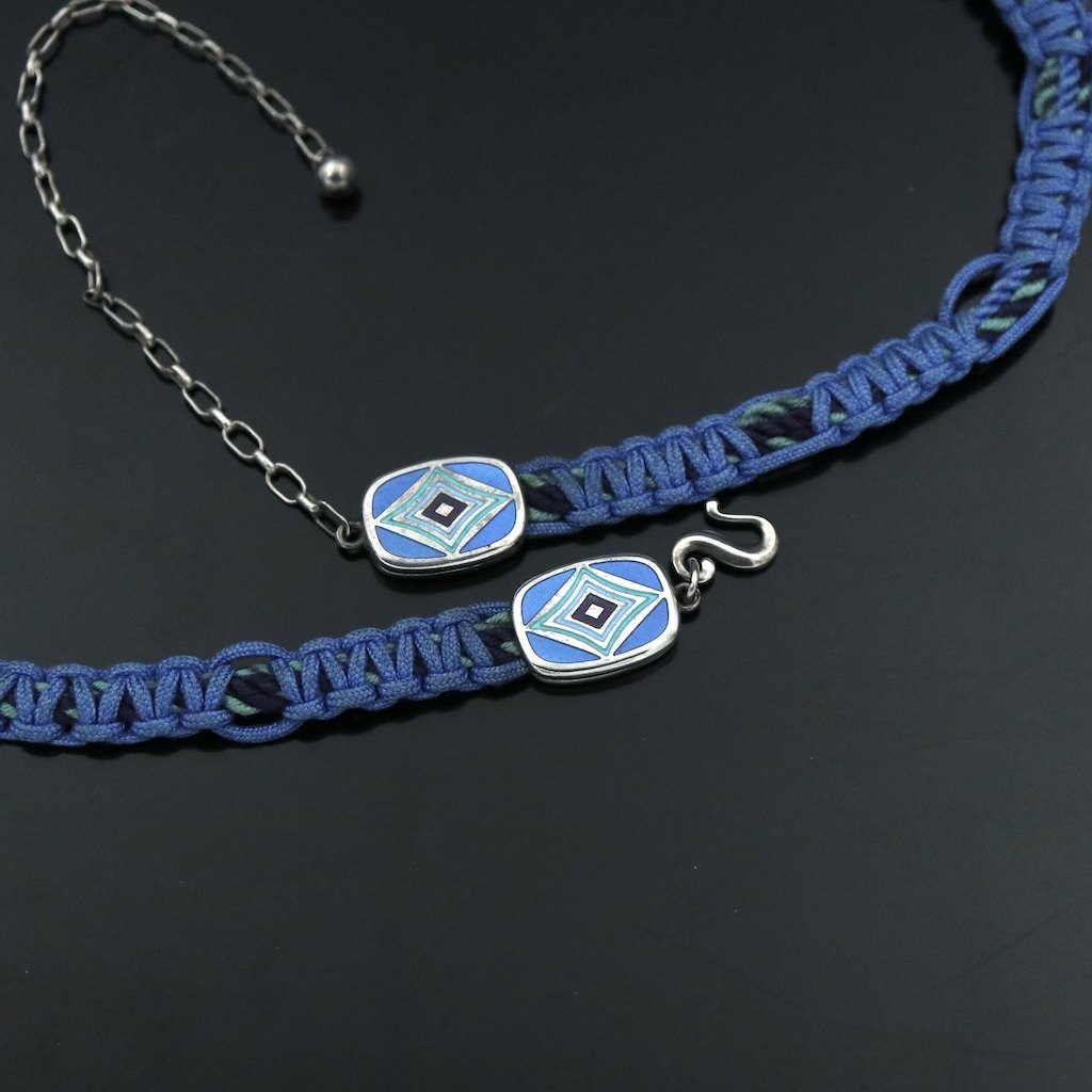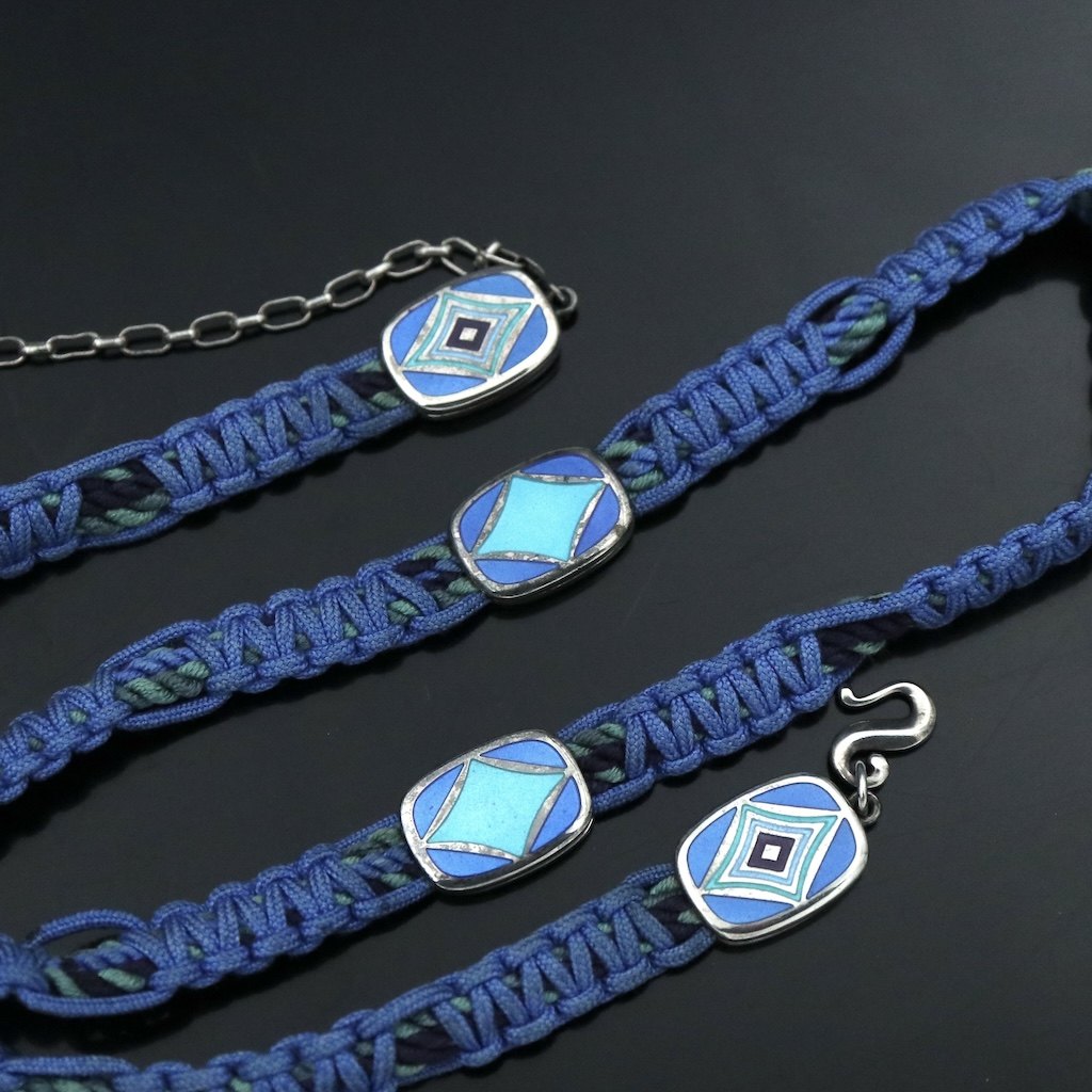 Text zugänglich auf Dänische: Georg Jensen. Macramé bælte med plaketter i sterling sølv med emalje - Naja Salto.