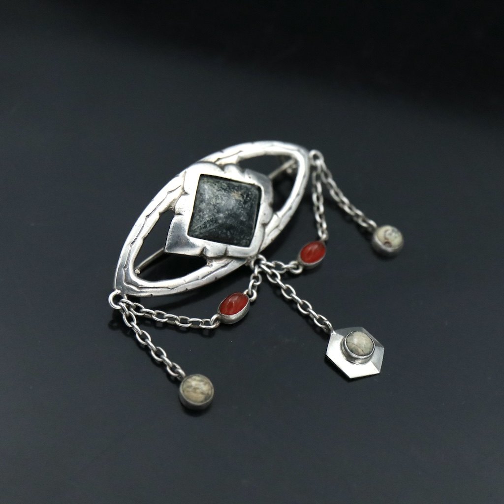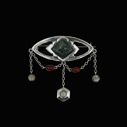 Text zugänglich auf Dänische: Mogens Ballin 1871-1914. Skønvirke Broche i sølv med sten.
