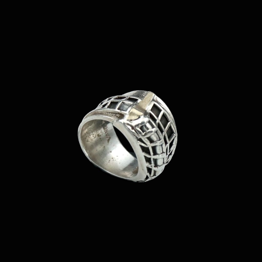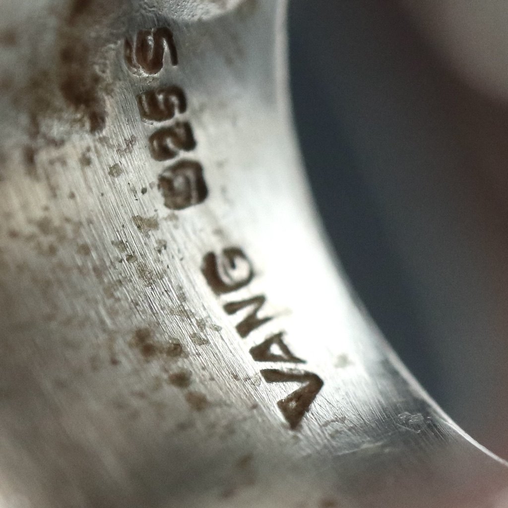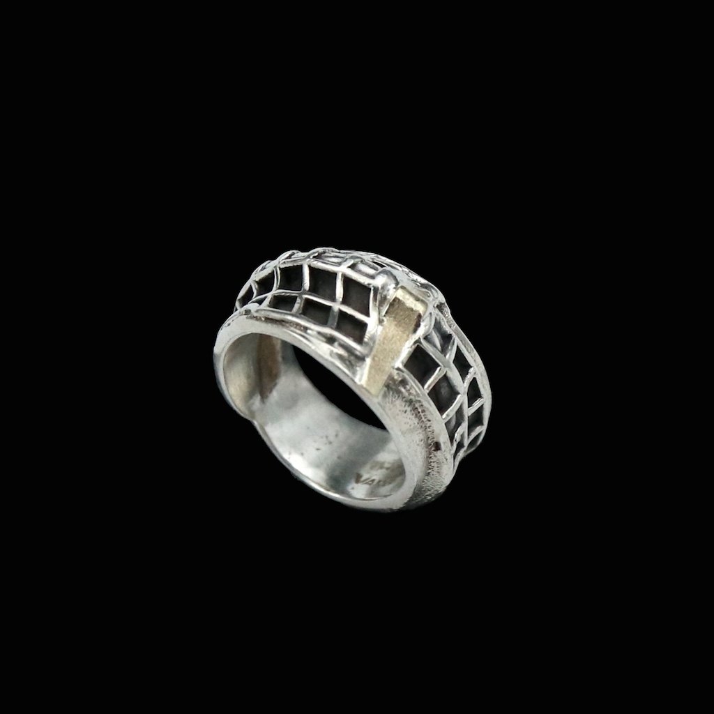 Text zugänglich auf Dänische: Jørgen Peter Vang. Ring i oxideret sterlingsølv med 14k guld.