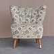 Text zugänglich auf Dänische: Ældre lænestol med ben i lakeret lys mahonie. Stolen er betrukket med lyst struktureret stof med blomstermønster og har sæde med springfjeder