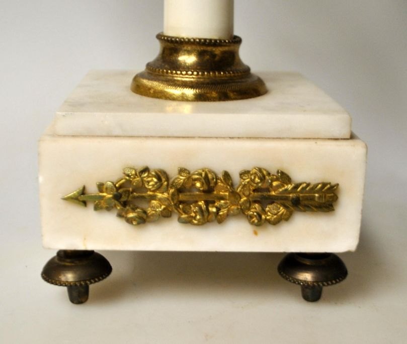 Ein Paar französische Kerzenleuchter aus weißem Marmor mit vergoldeter Bronze, 19. Jahrhundert. Sockel und Stiel aus weißem Marmor. Jeder Leuchter hat zwei Kerzenarme aus vergoldeter Bronze. Mit Verzierungen an Sockel, Armen und Mittelstück. Höhe: 35 cm. Perfekter Zustand!