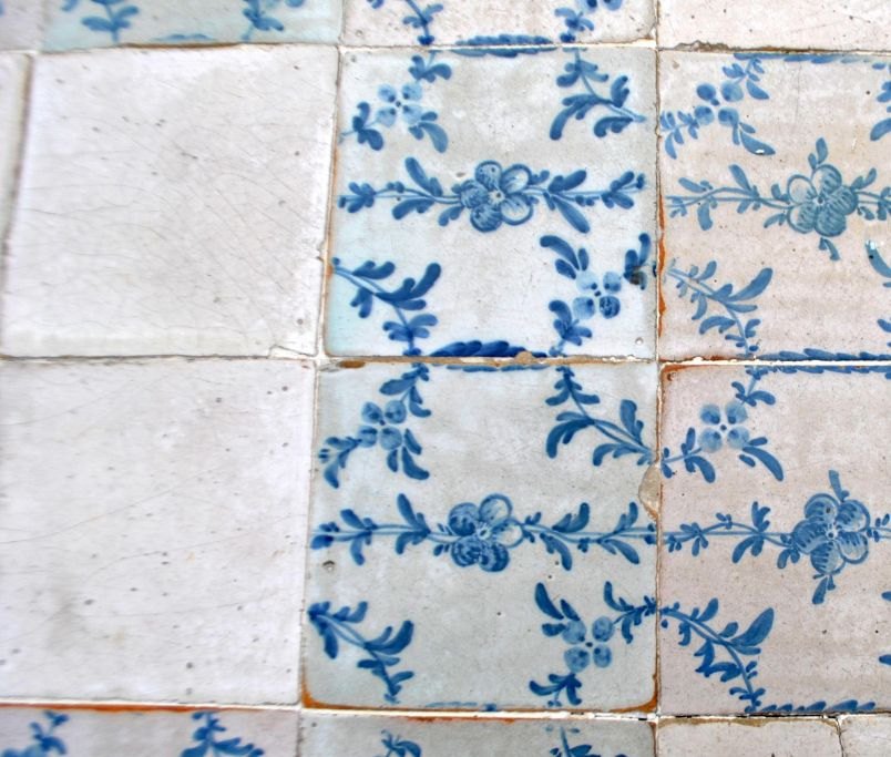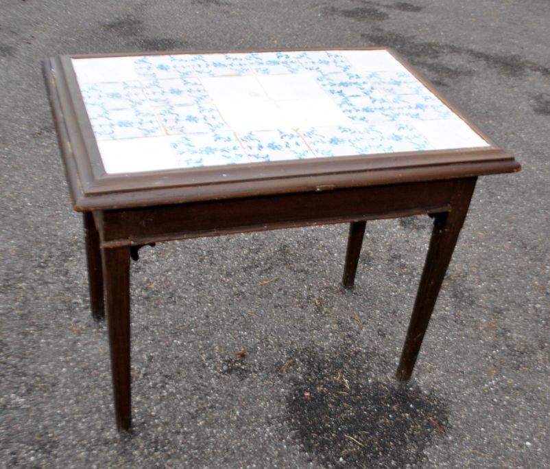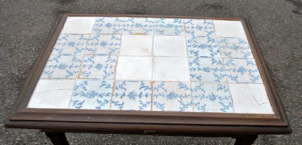 Seltener original braun bemalter Fliesentisch, Louis XVI, 1780, Dänemark. Mit konisch zulaufenden Beinen. Mit 16 traumhaft seltenen blau bemalten Ornamentfliesen mit Blumen und Ranken von Morsø Fabrikken im Muster. Außerdem 8 komplett weiße Fliesen aus der gleichen Zeit – vermutlich aus – Kopenhagen. Die weißen Fliesen liegen wie ein Quadrat in der Mitte und eine in jeder Ecke. Höhe: 70 cm. L.: 89 cm. T.: 62 cm. Provenienz: Ein alter großer Fachwerkhof in Hårmark auf Samsø. Der Tisch wirkt original – allerdings mit Restaurierungen, u.a. mit Klammern am Rand. Ursprünglich gab es an einem Ende eine Schublade und an jedem Ende ausziehbare Tabletts. Die 4 weißen Fliesen in den Ecken weisen Mängel auf.