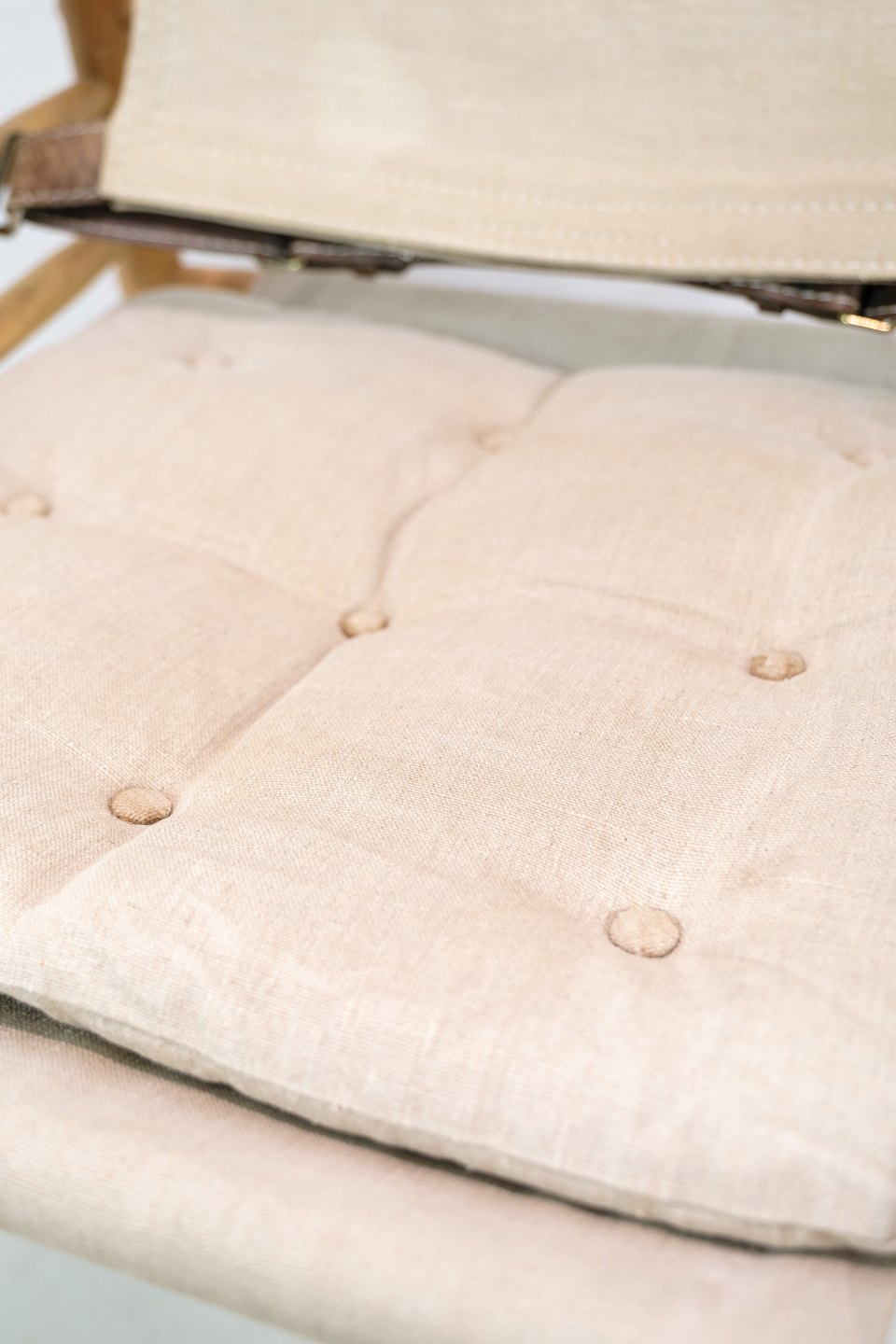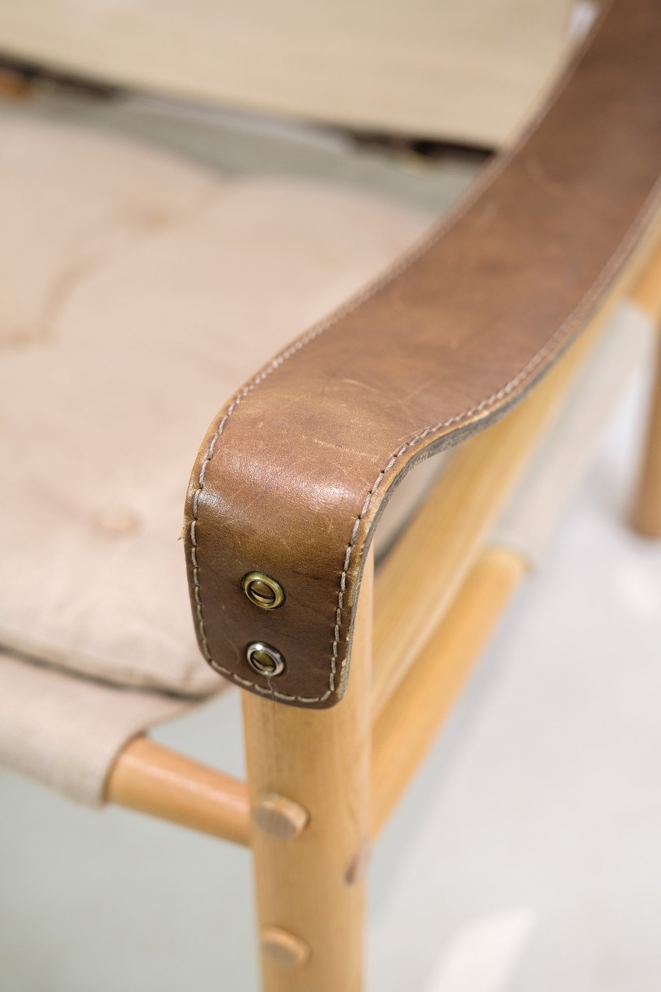 Sirocco-stolen er kendt for sin ikoniske safarikonstruktion, hvor læderremme og spændinger skaber komfort uden behov for lim eller beslag.