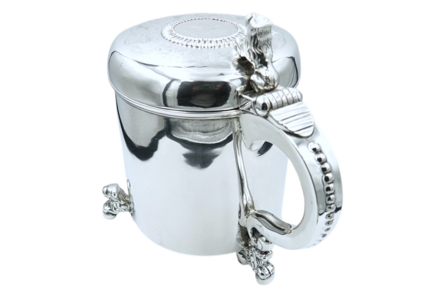 Dansk sølv, stort lågkrus med indlagt dansk sølvmønt og løvefødder og løve på låget. Mønten er fra 1729, og vi mener at kruset er fra omkring 1790 til 1810.