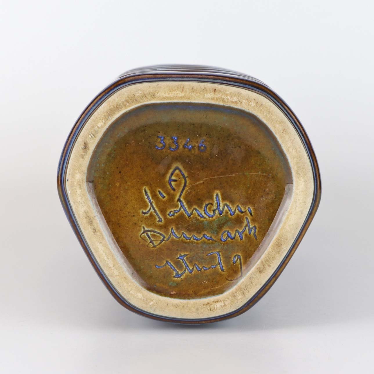 Text zugänglich auf Dänische: Kantet vase i stentøj fra serien EJ 64 med blå glasur og udstående mønster. Nr. 3346