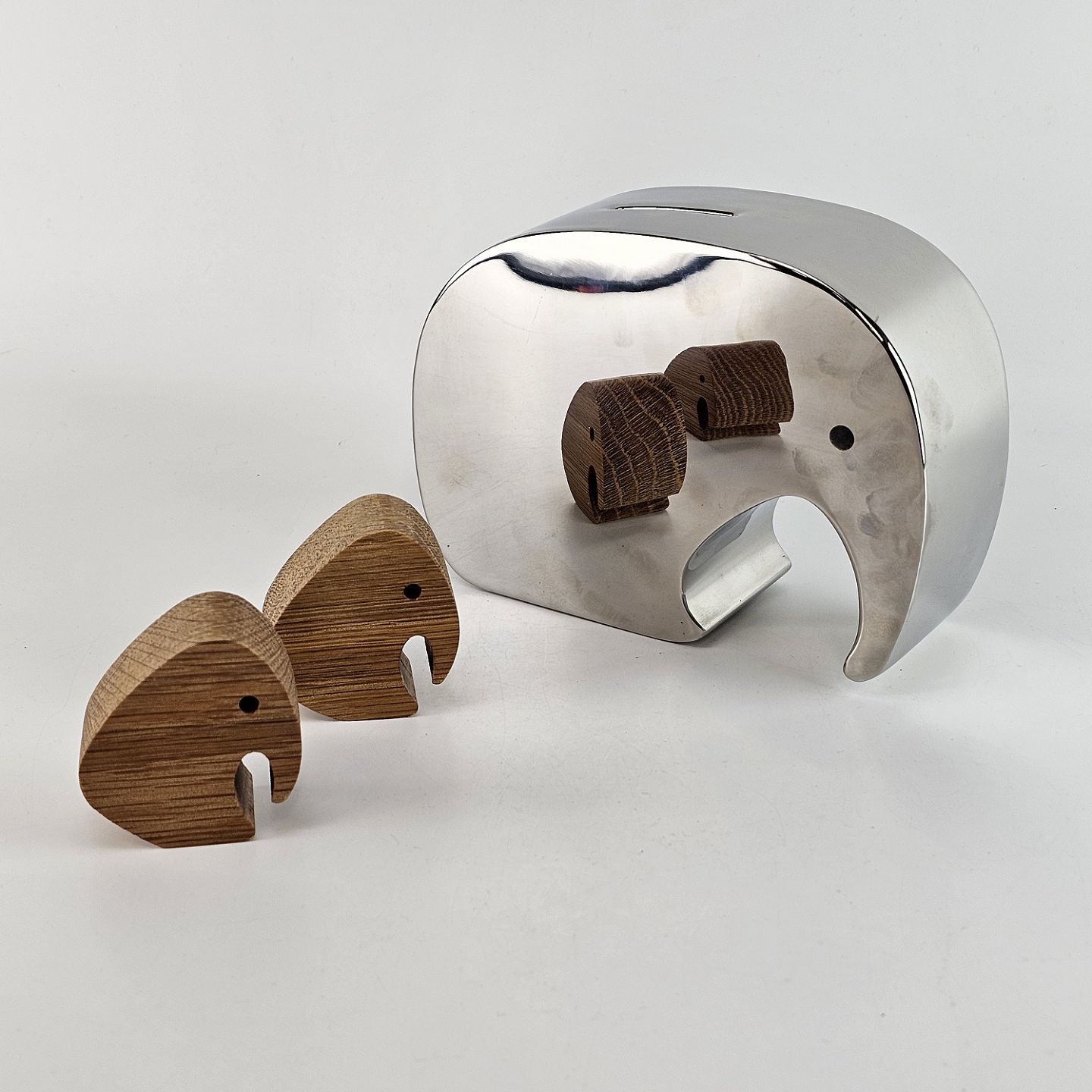 Poleret rustfrit stål, de to små er udført i egetræ.