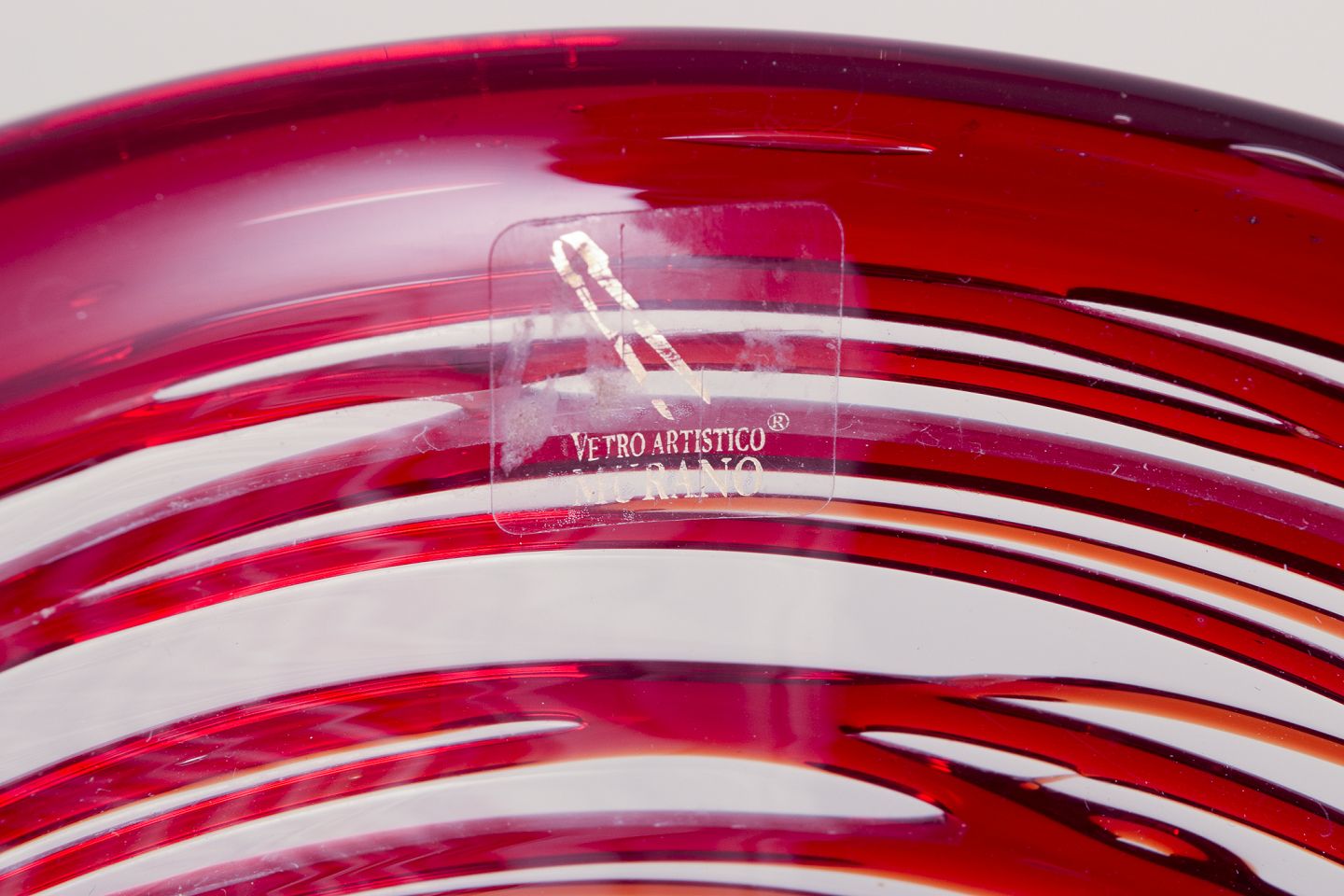 Kolossal unika bordskål af glas, prydet med horisontale røde glasdekorationer i relief. Håndlavet.