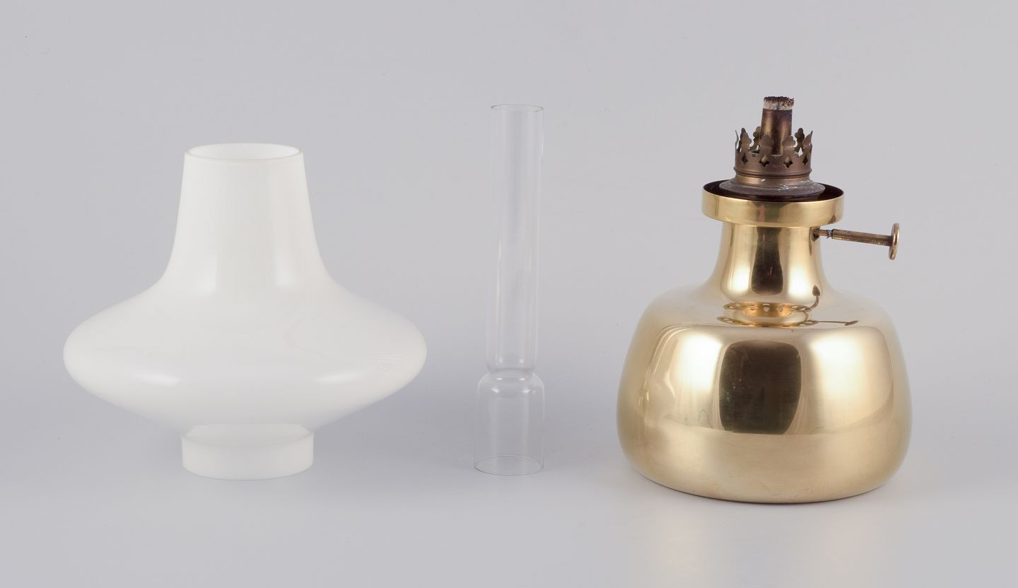 Petronella olielampe i messing med skærm af opalglas.