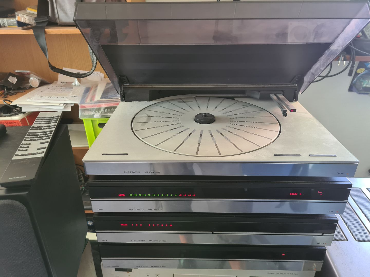 B&O anlæg fra 7000 serien i sølv/sort. Delvist til restaurering/reservedele. Beomaster 7000 virker fint. Beomaster CD virker fint. Beocord lyser og skuffen virker, men ikke funktionerne vedrørende afspilning af kasettebånd. Beogram pick-up armen flytter sig ikke, og skiven drejer heller ikke. Ældre fjernbetjening medfølger.