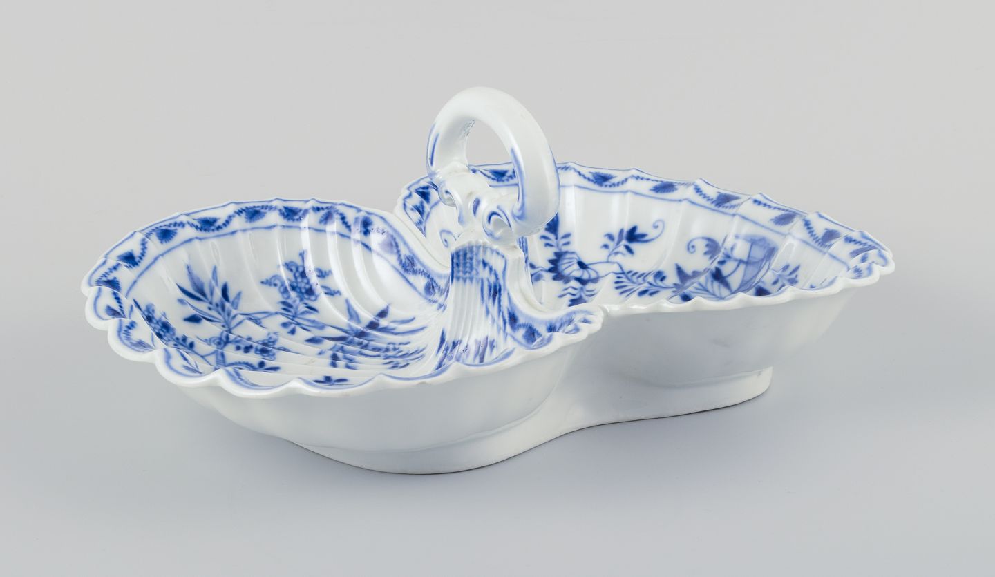 Text zugänglich auf Dänische: Meissen, Tyskland. Løgmønstret cabaretfad af porcelæn, todelt med hank.