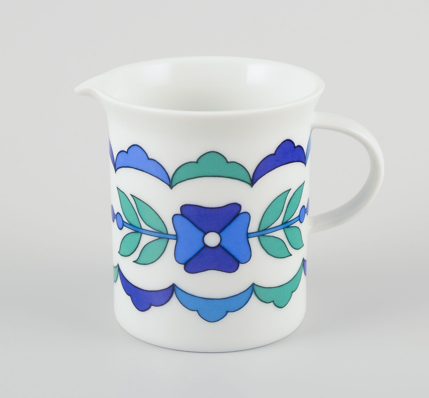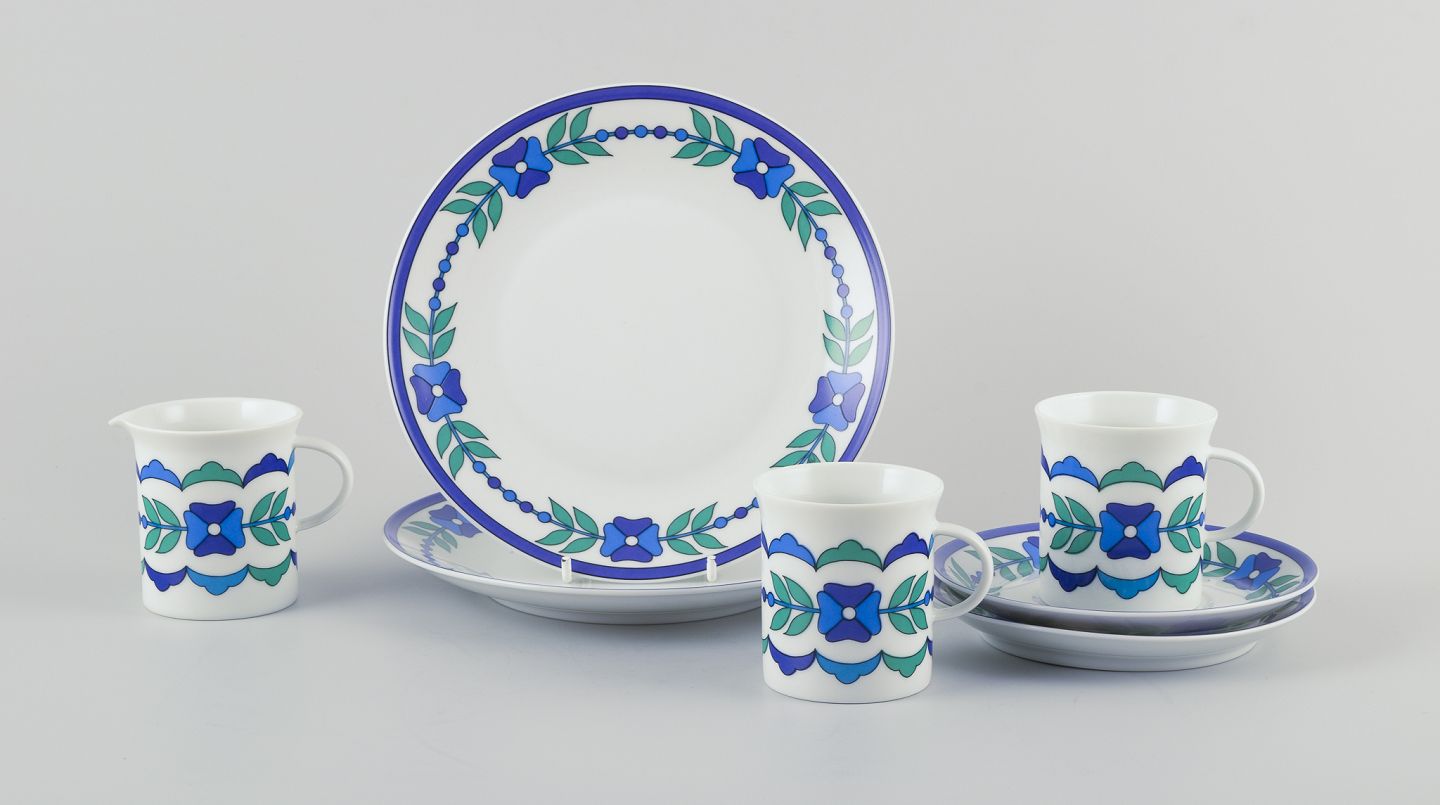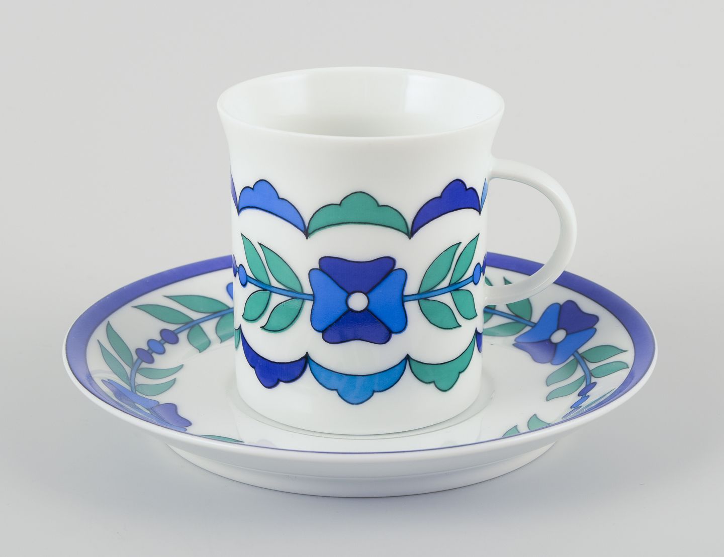 Text zugänglich auf Dänische: Emilio Pucci for Rosenthal Studio-Linie, Tyskland. To kaffekopper med underkopper, to kagetallerkner og en flødekande af porcelæn.