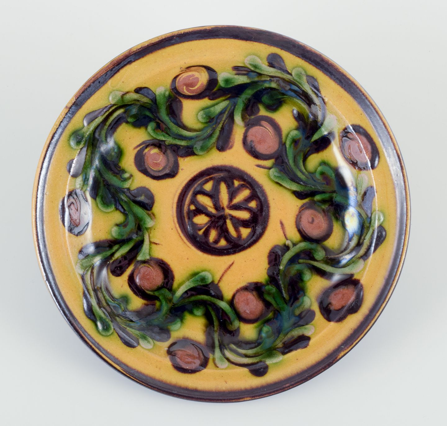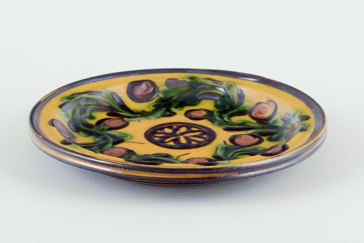 Fad/vægrelief af keramik med blomstermotiv. Glasur i grønne og sorte toner på okkergul bund.