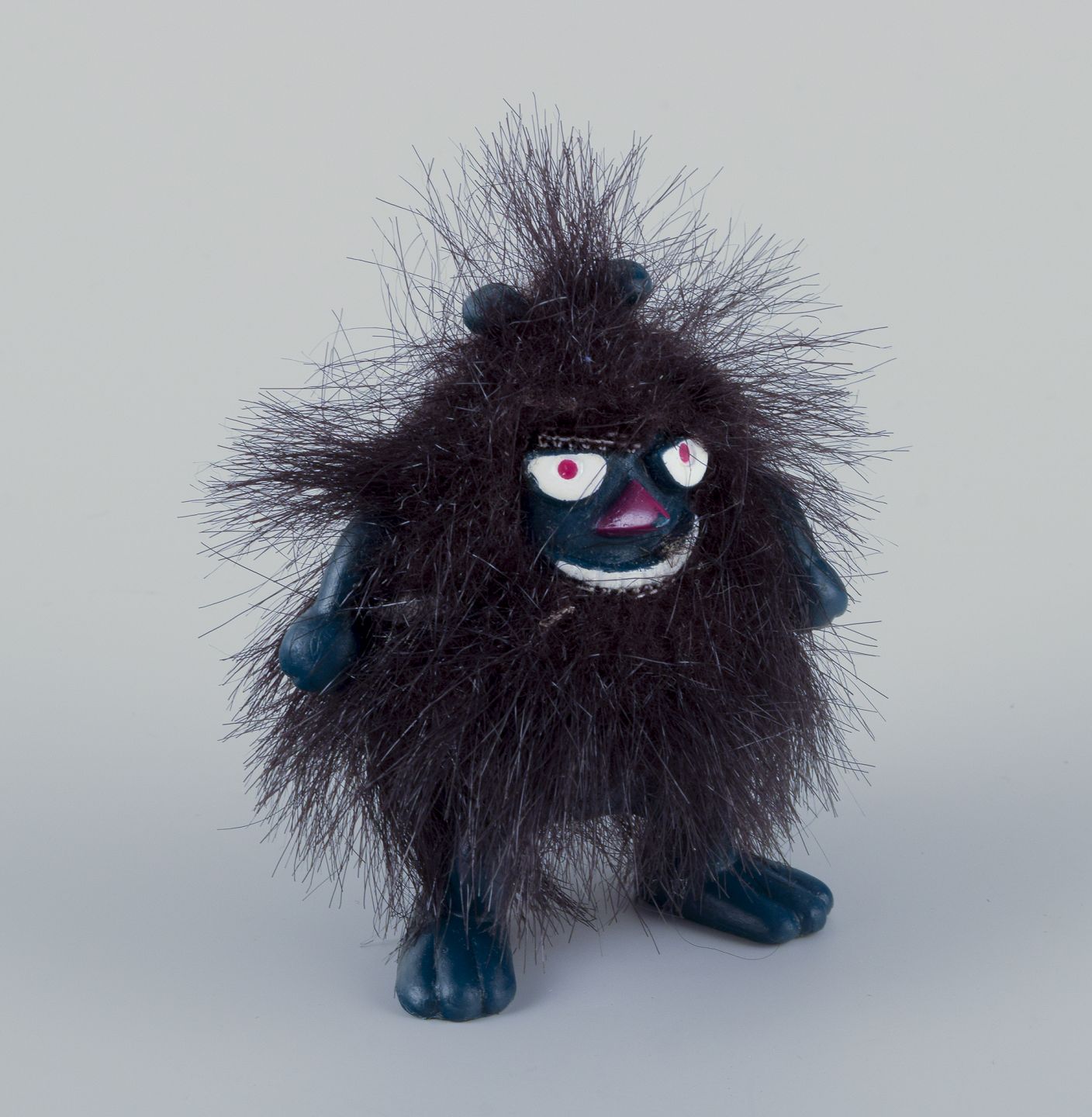 Text zugänglich auf Dänische: Martinex, Finland. "Stinky" Mummi figur af mørkeblåtplast beklædt med sort hår.