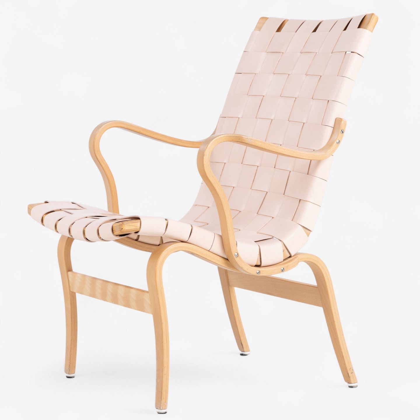 'Eva'-lænestol i patineret bøg og nyt flettet naturgjorde. Mærket fra producent.