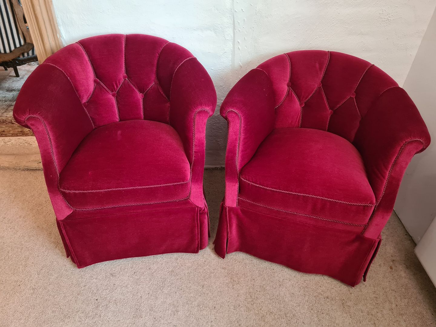 Par lænestole fra 1950'erne overbetrukket med rødt velour. Fremstår pæne og velholdte uden nævneværdige brugsspor.