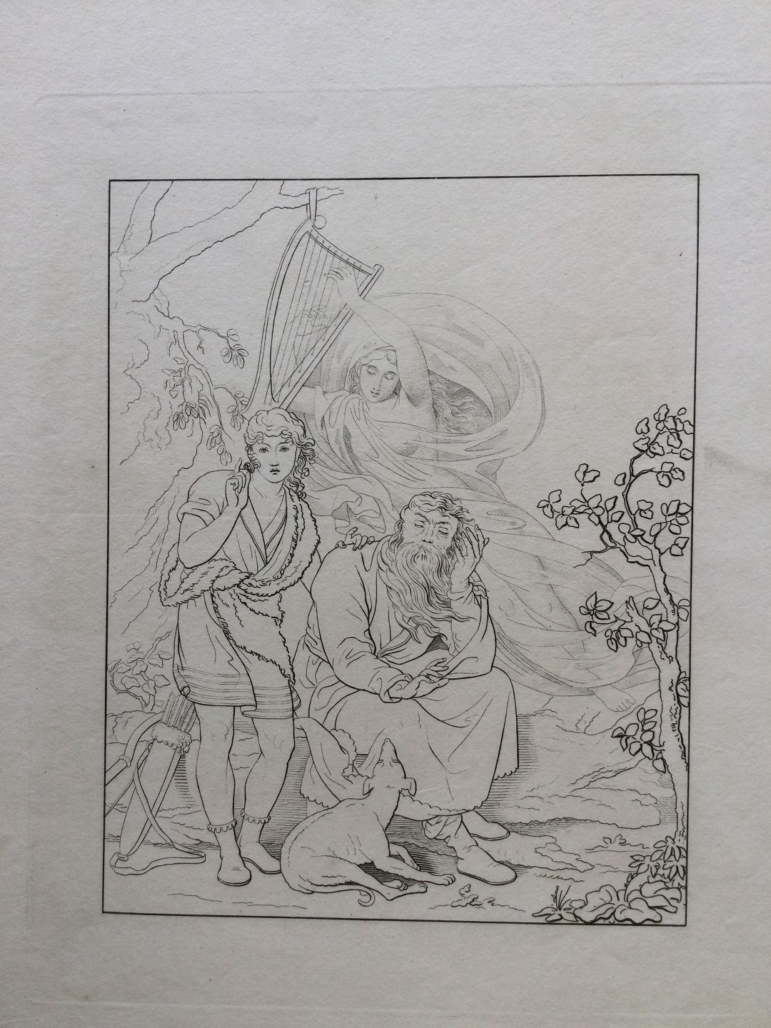 Text zugänglich auf Dänische: Radering efter C.G. Kratzenstein-Stubs "Ossian og Alpins Søn hører Malvinas Ånd gribe i Harpens Strenge" fra 1815.