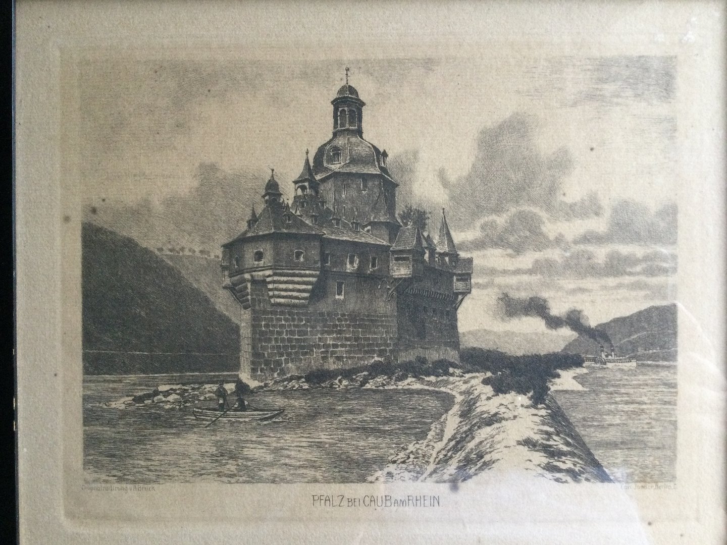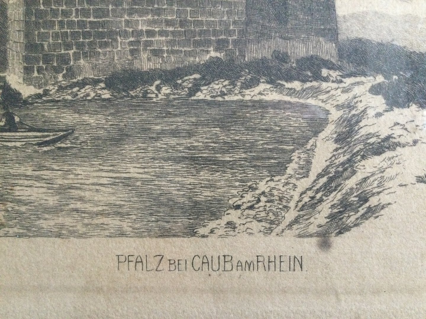 Text zugänglich auf Dänische: Radering af Albrecht Bruck - Pfalzgrafenstein Slot, Tyskland,